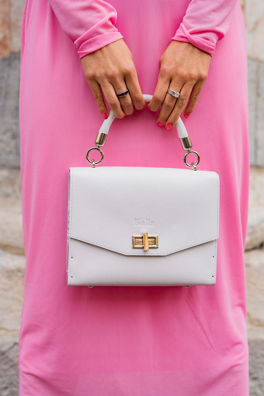 Rebeca White Leather Bag with Artistic Wood Inlay and Marine DesignRegular price $550.00 USDRegular priceUnit price / per-