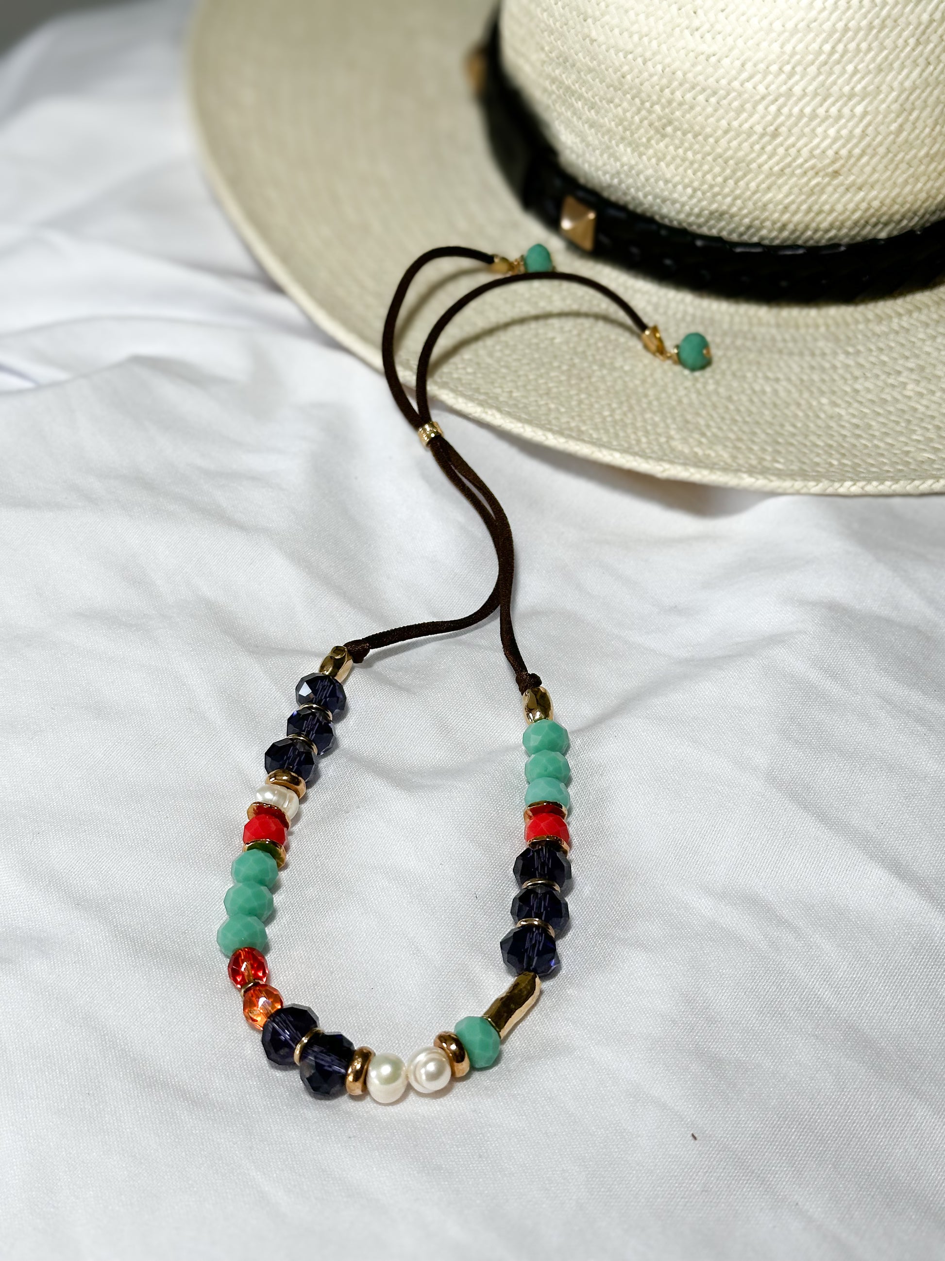 Handcrafted with a rich brown cord, this choker features a playful mix of deep navy, turquoise green, coral orange, amber, and natural pearl accents — all highlighted with elegant gold-tone details.