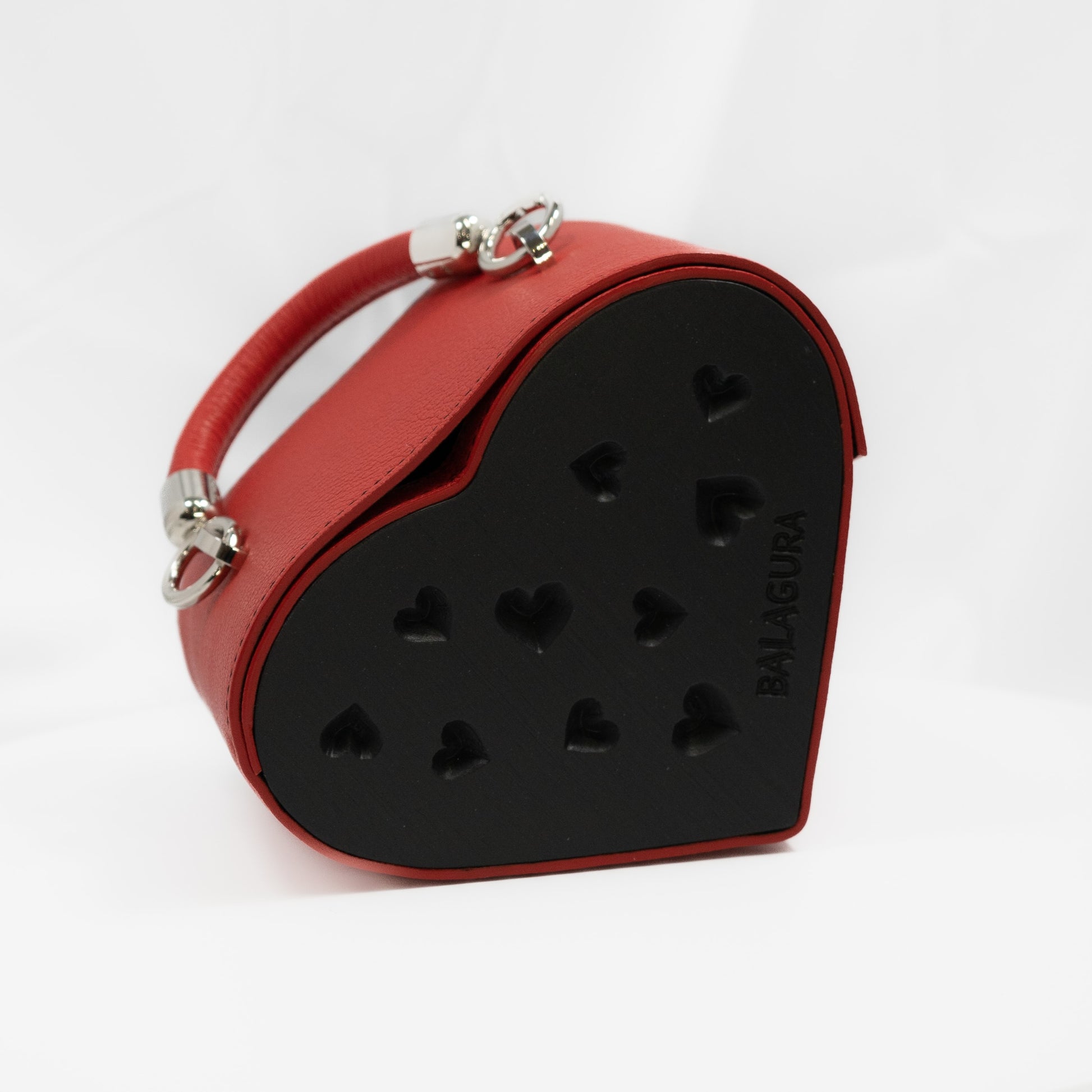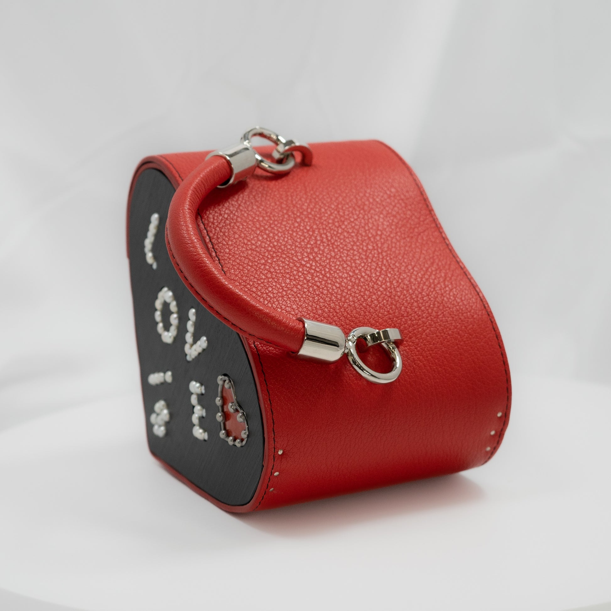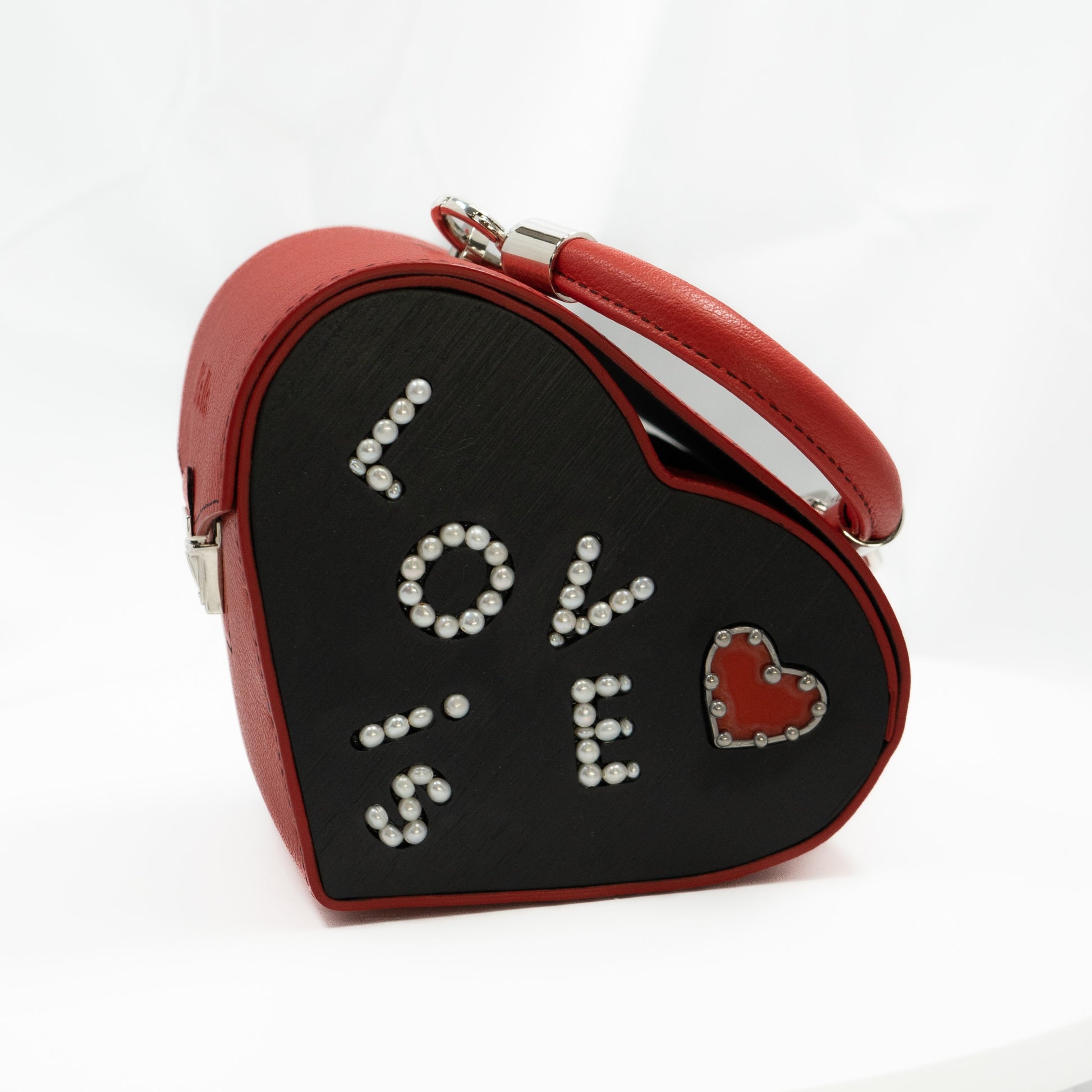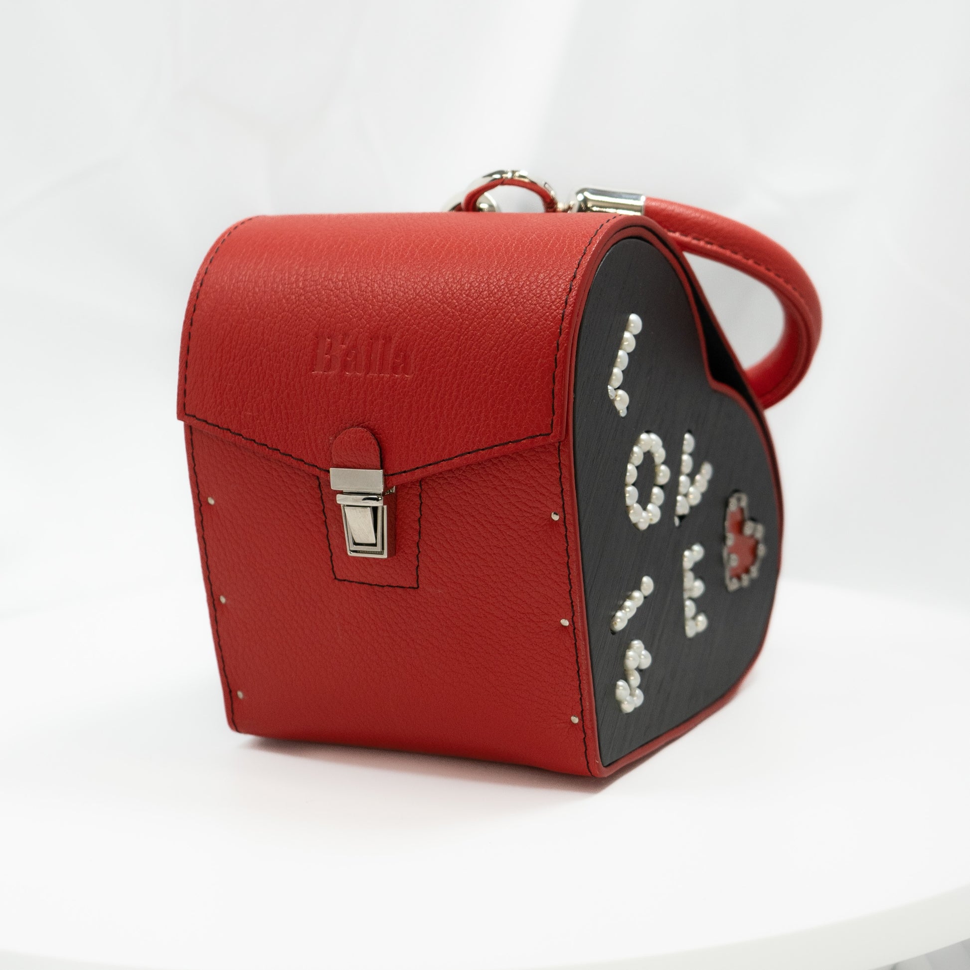 Crafted from Italian leather, lined with Alcantara inside, with American oak walls. Silver-toned hardware imported from Italy. Decorative heart-shaped glass elements. The bag features a short leather handle.