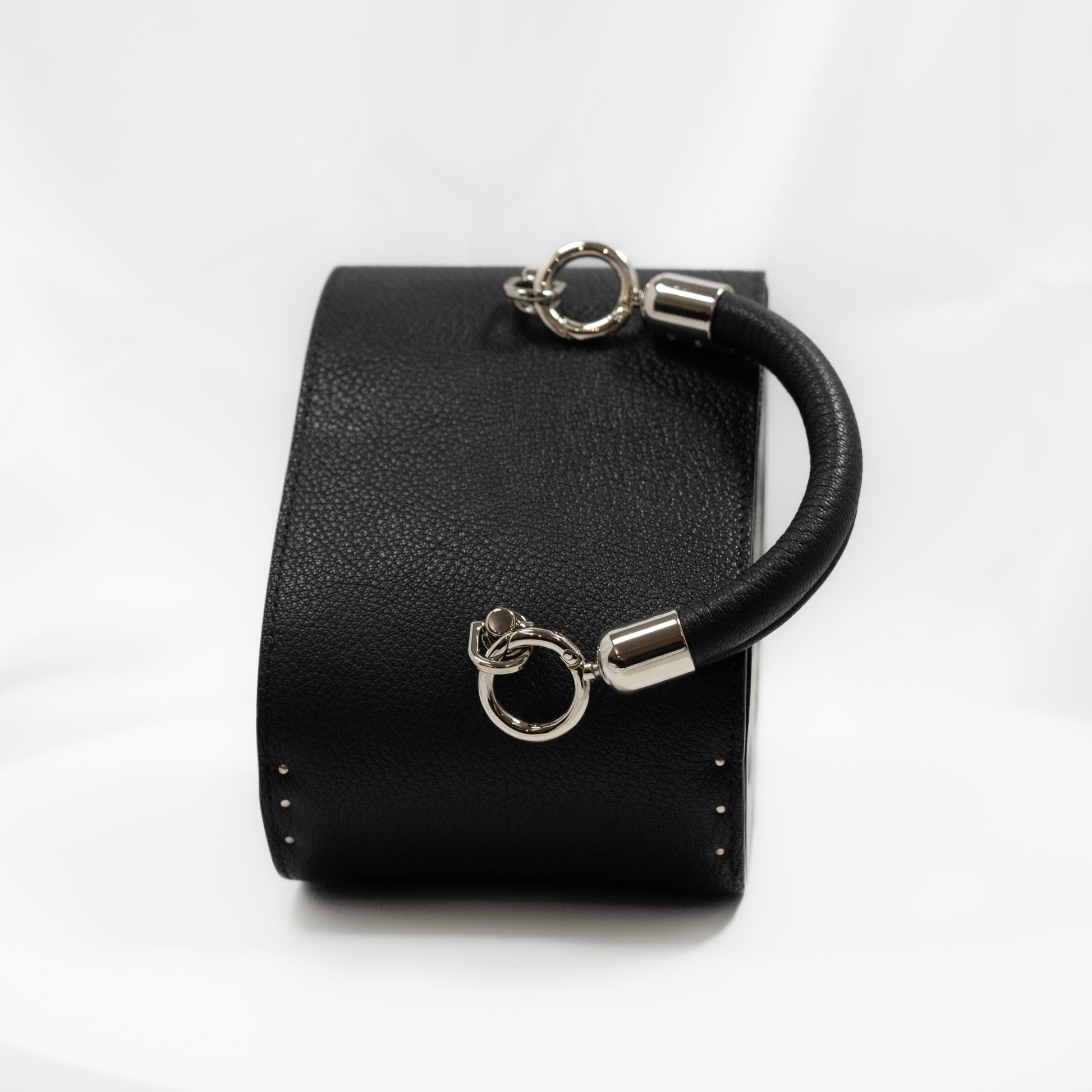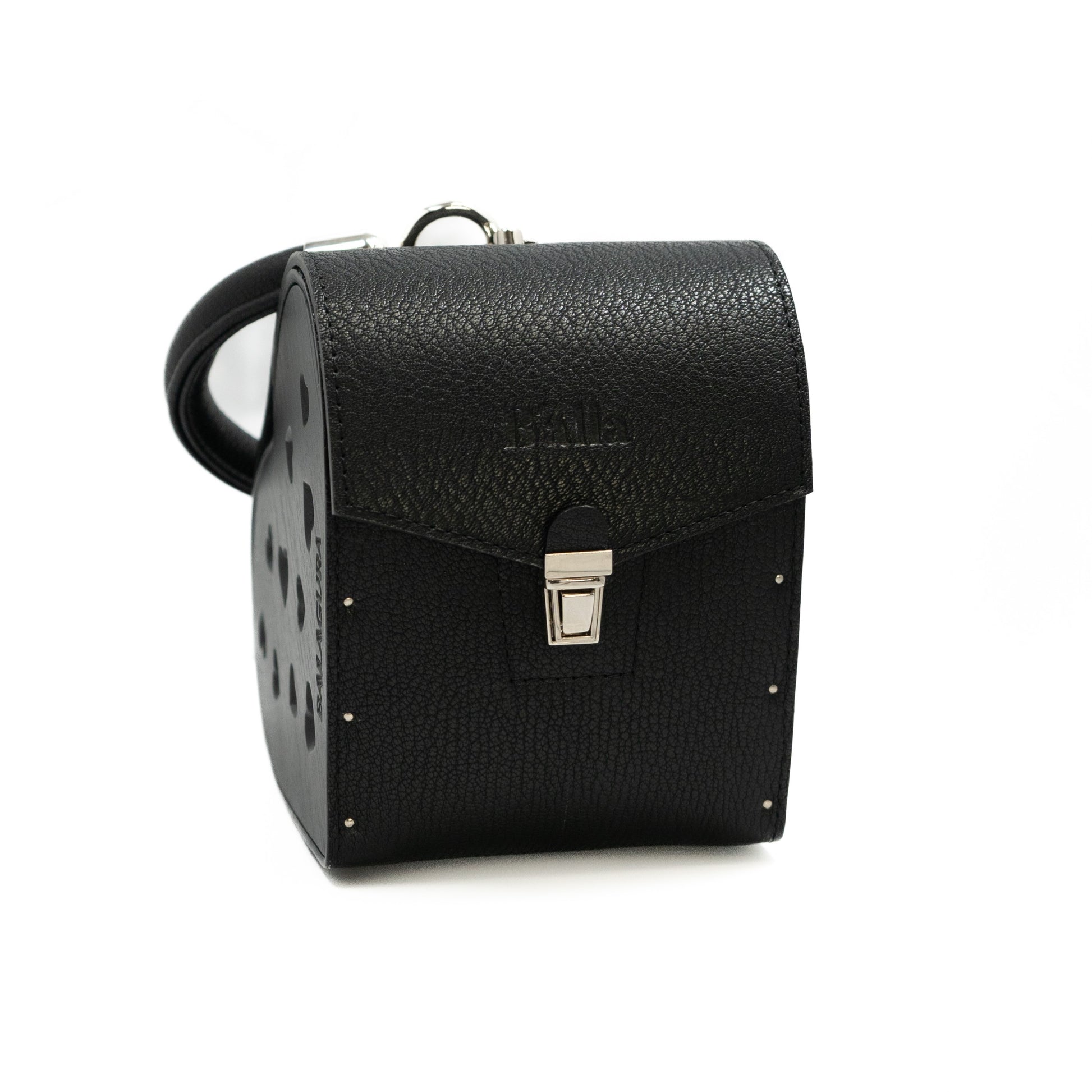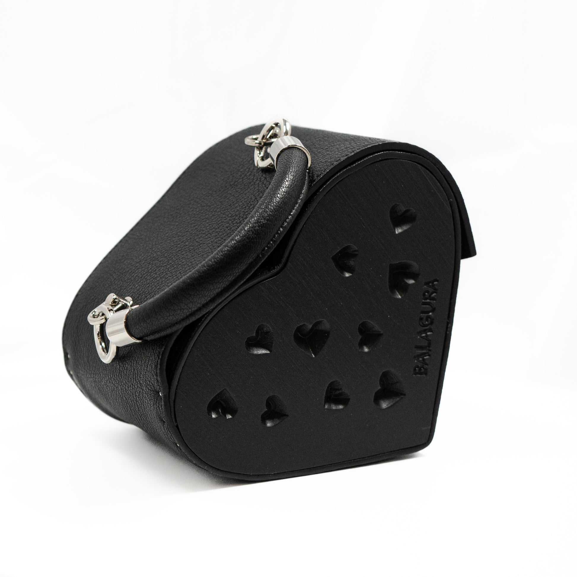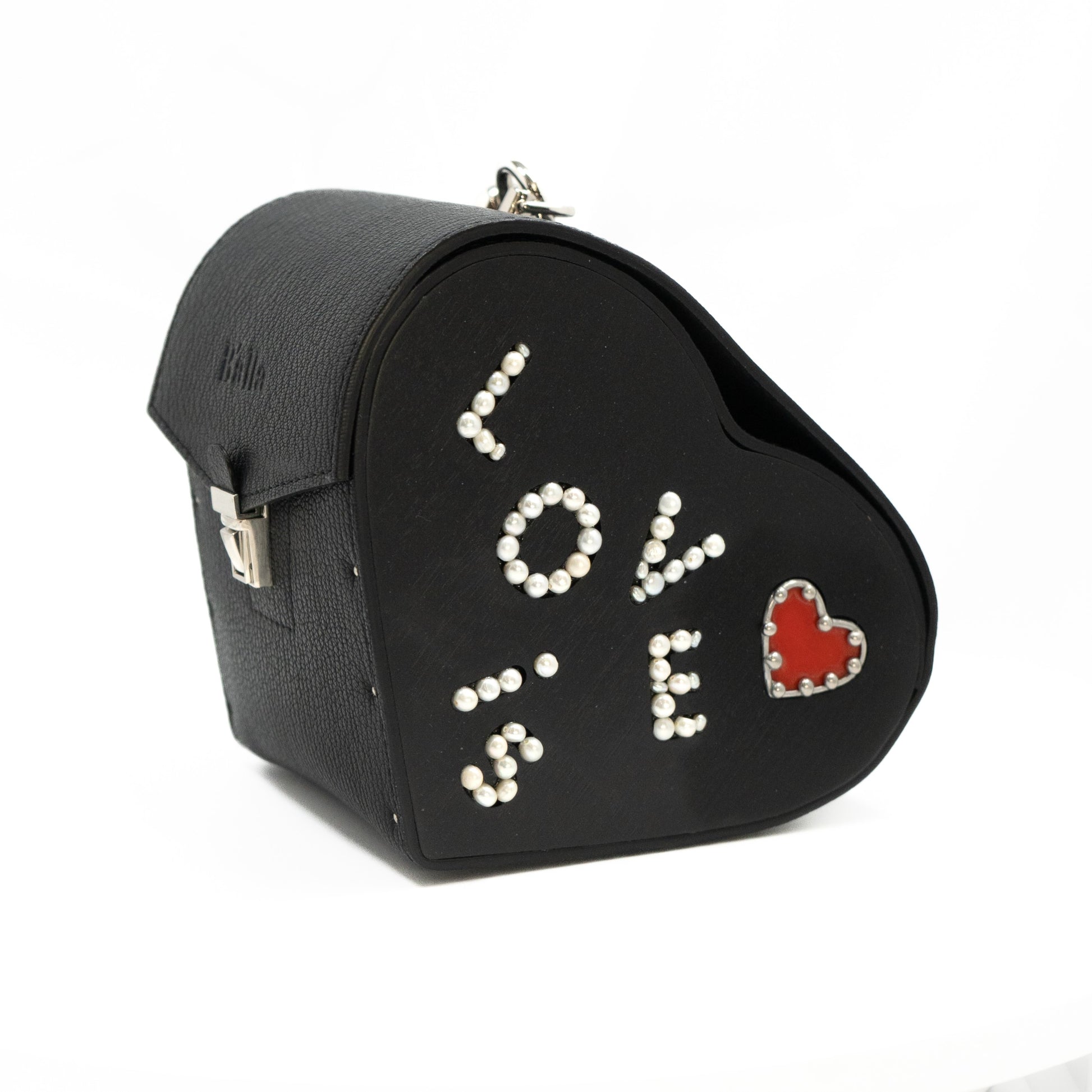 Crafted from Italian leather, lined with Alcantara inside, with American oak walls. Silver-toned hardware imported from Italy. Decorative heart-shaped glass elements. The bag features a short leather handle.