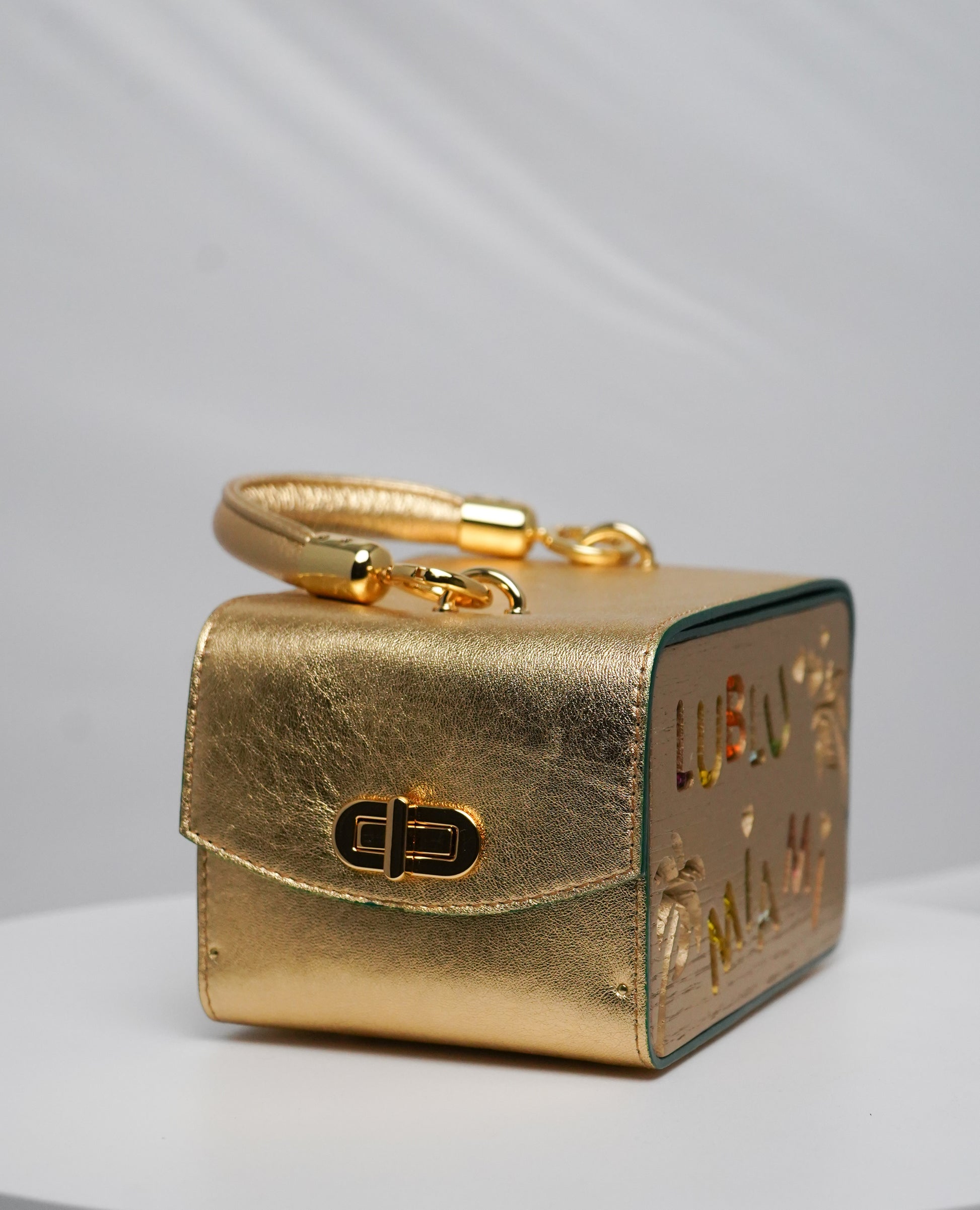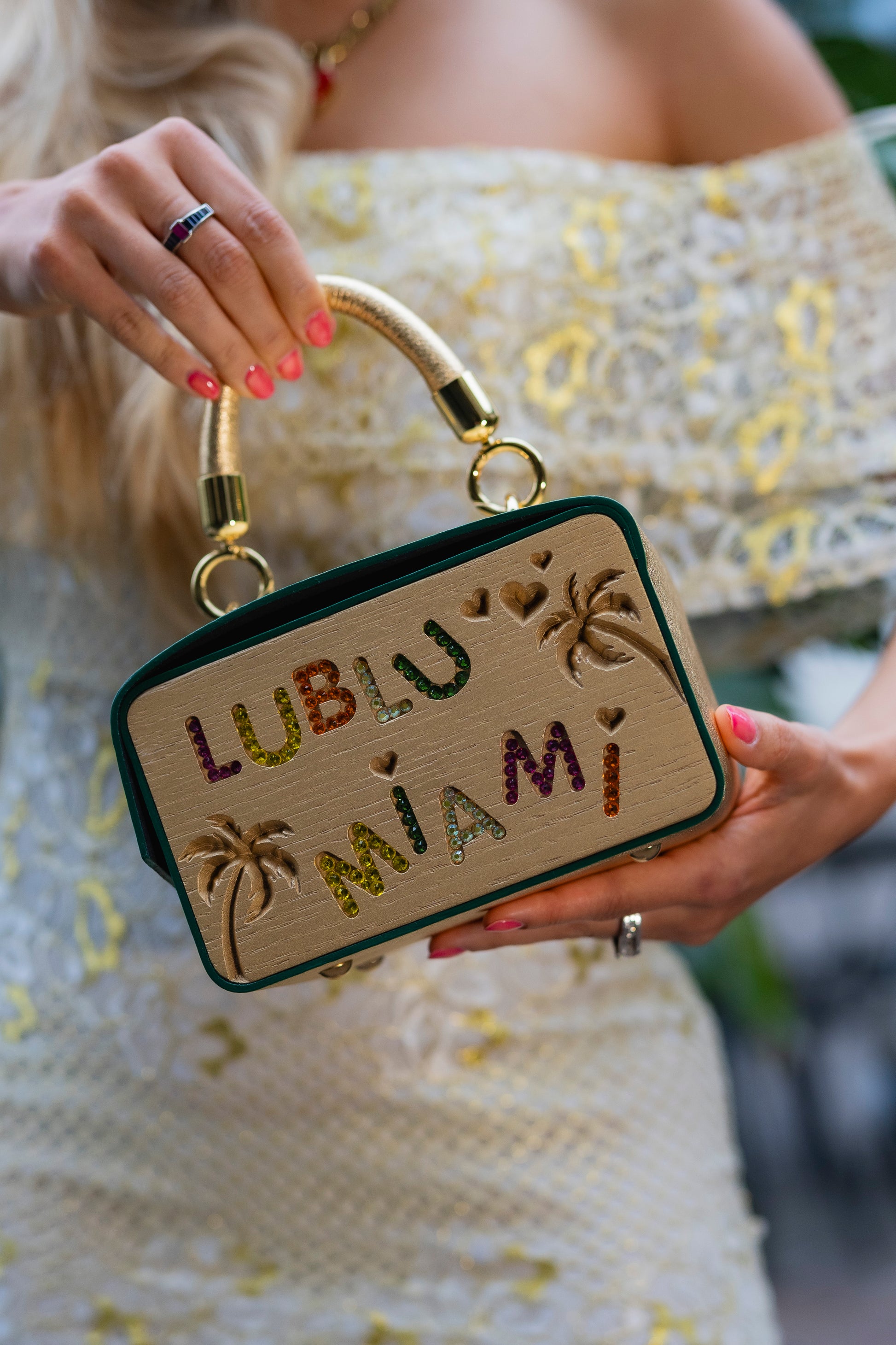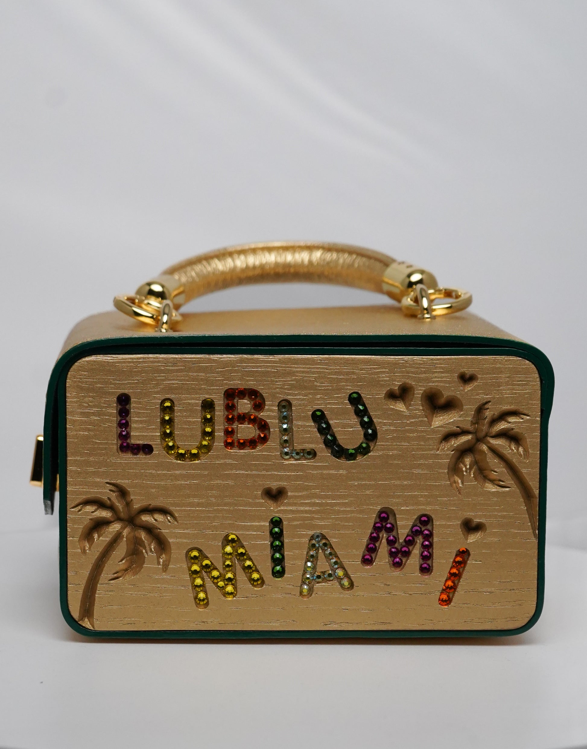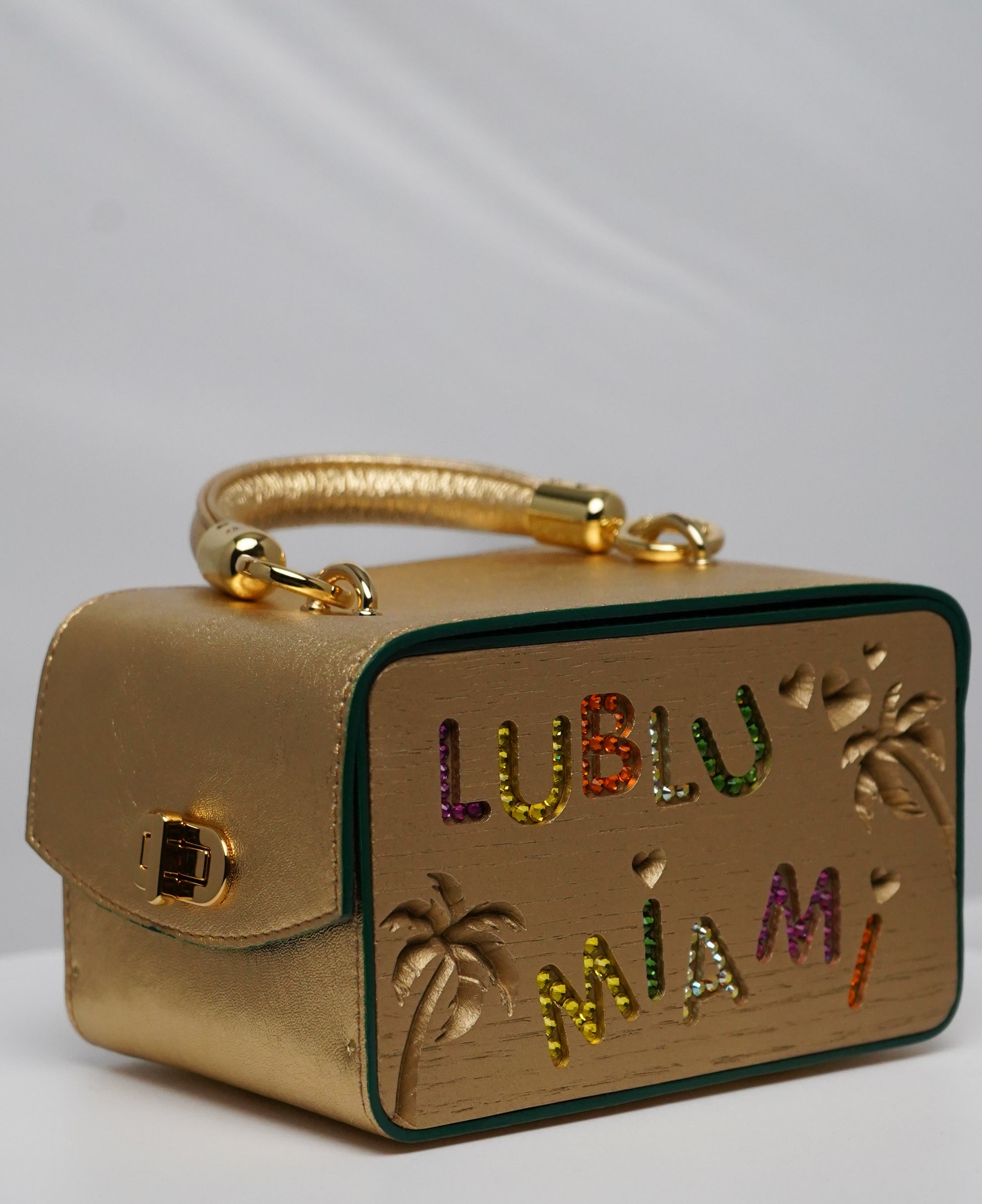 Experience the perfect fusion of elegance and tropical charm with the LUBLU MIAMI gold leather handbag. Crafted from premium gold leather, this structured bag features a natural wood front panel adorned with multicolored rhinestones (strass) spelling out “LUBLU MIAMI.” The playful palm tree and heart accents bring a fun, Miami-inspired vibe to the design, while the shimmering gold handle and hardware add a luxurious touch. This handbag seamlessly blends style and function, making it ideal for day-to-night transitions.