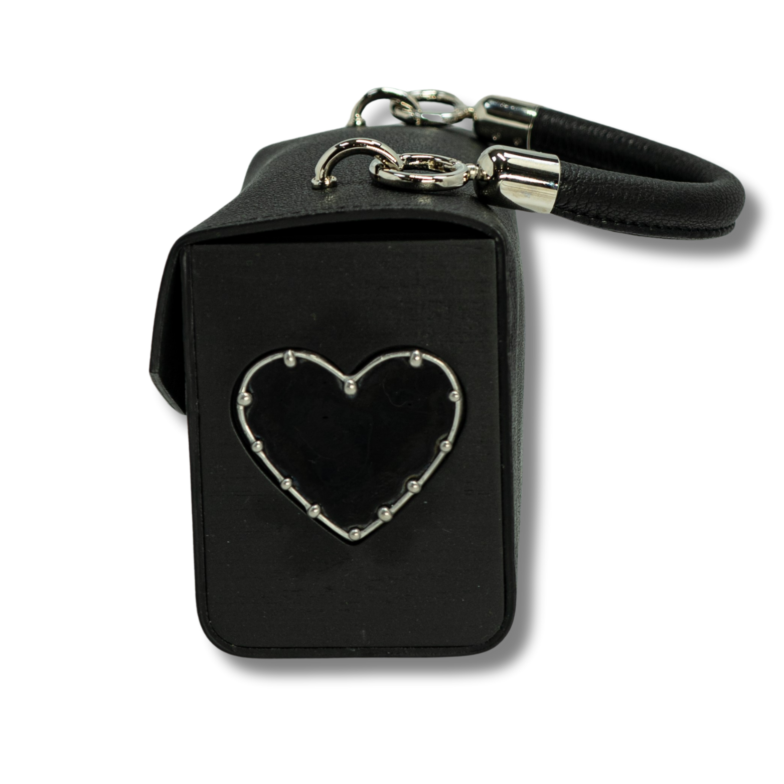 Introducing our handbag made from bflack Italian leather, featuring wooden sides inlaid with black glass hearts. The interior is lined with luxurious Italian Alcantara, blending sophistication and unique craftsmanship in one exquisite design.