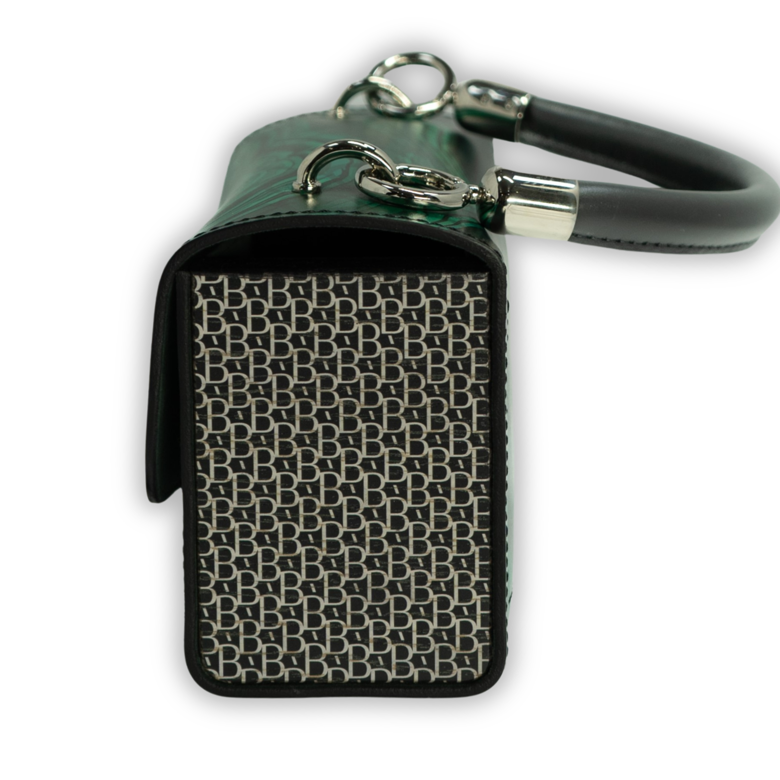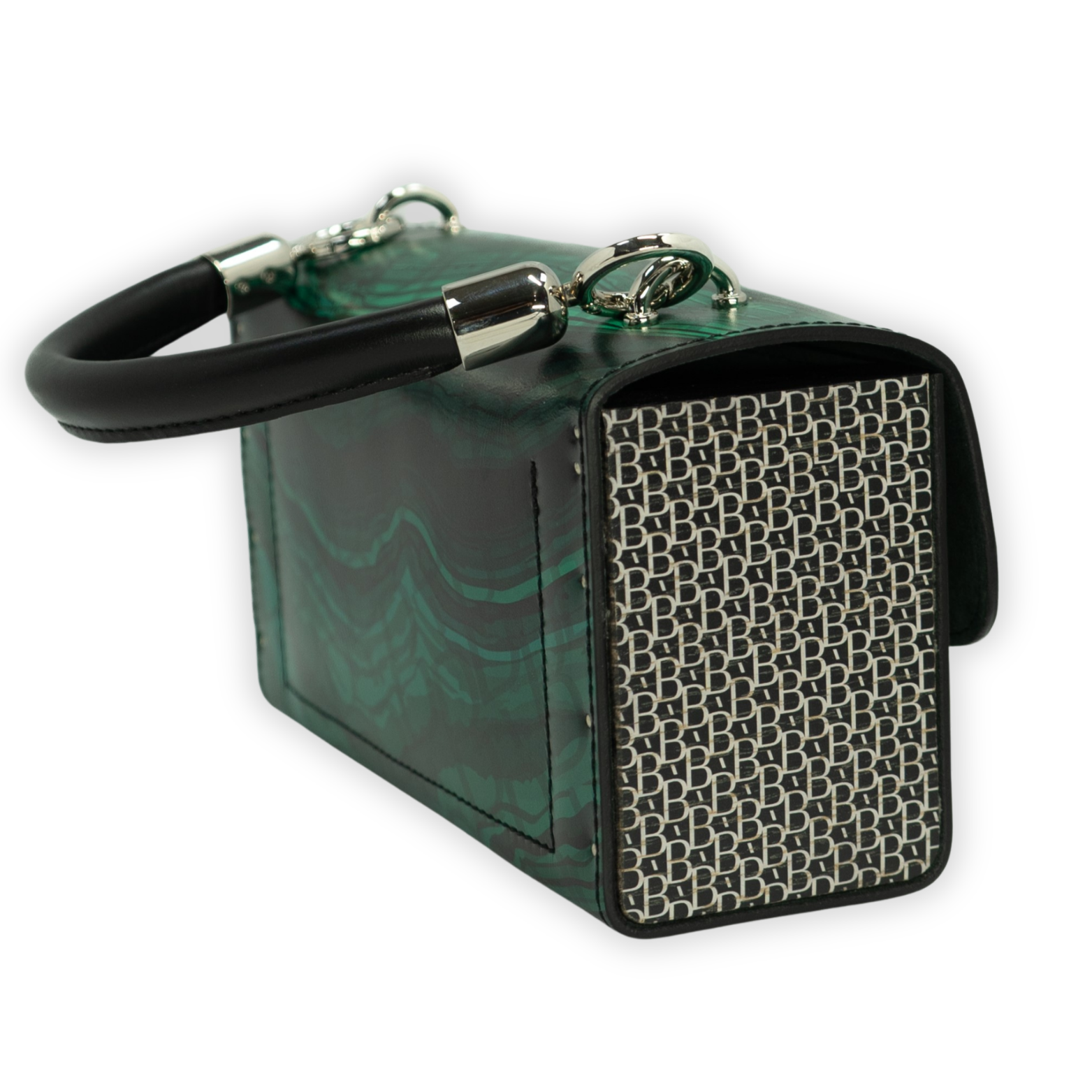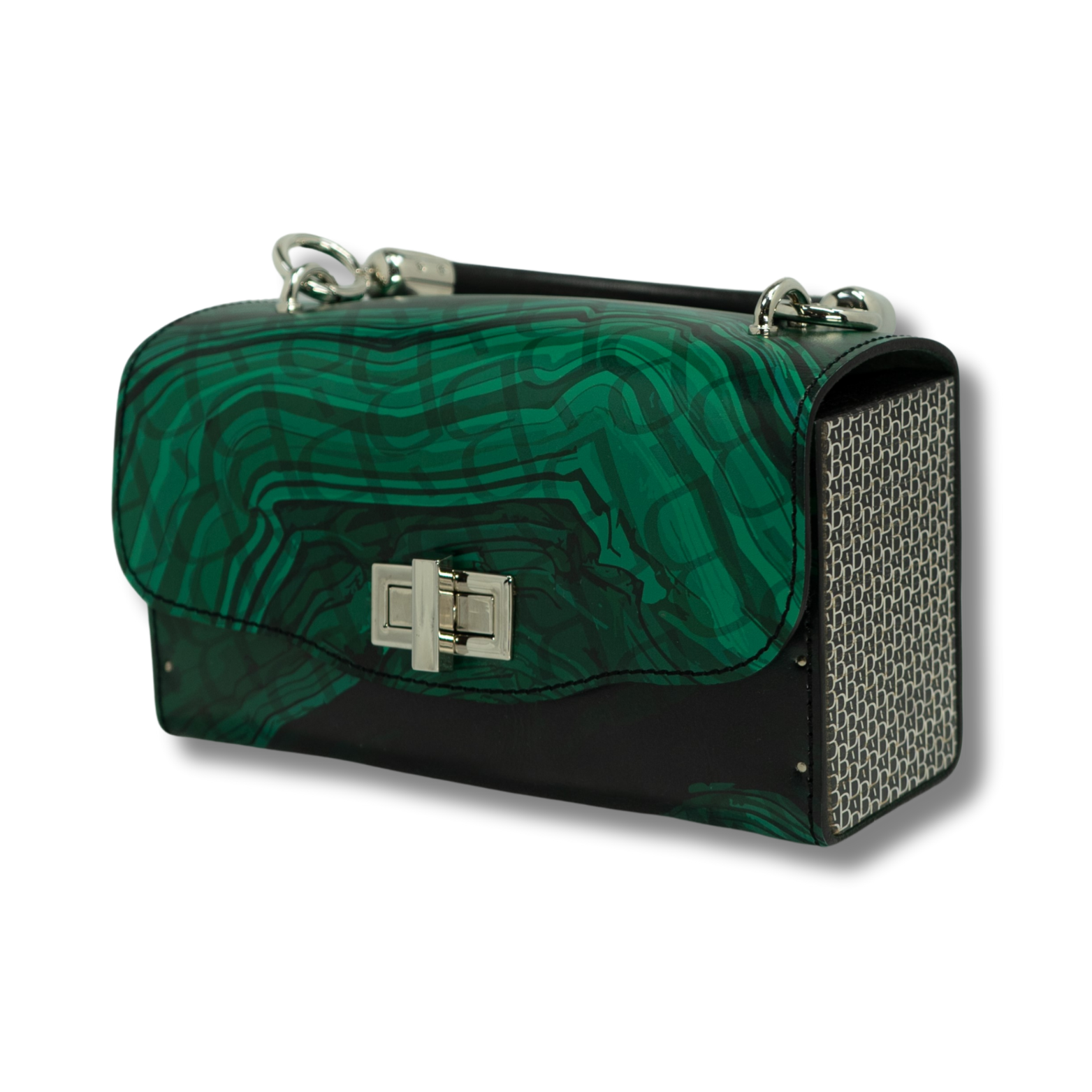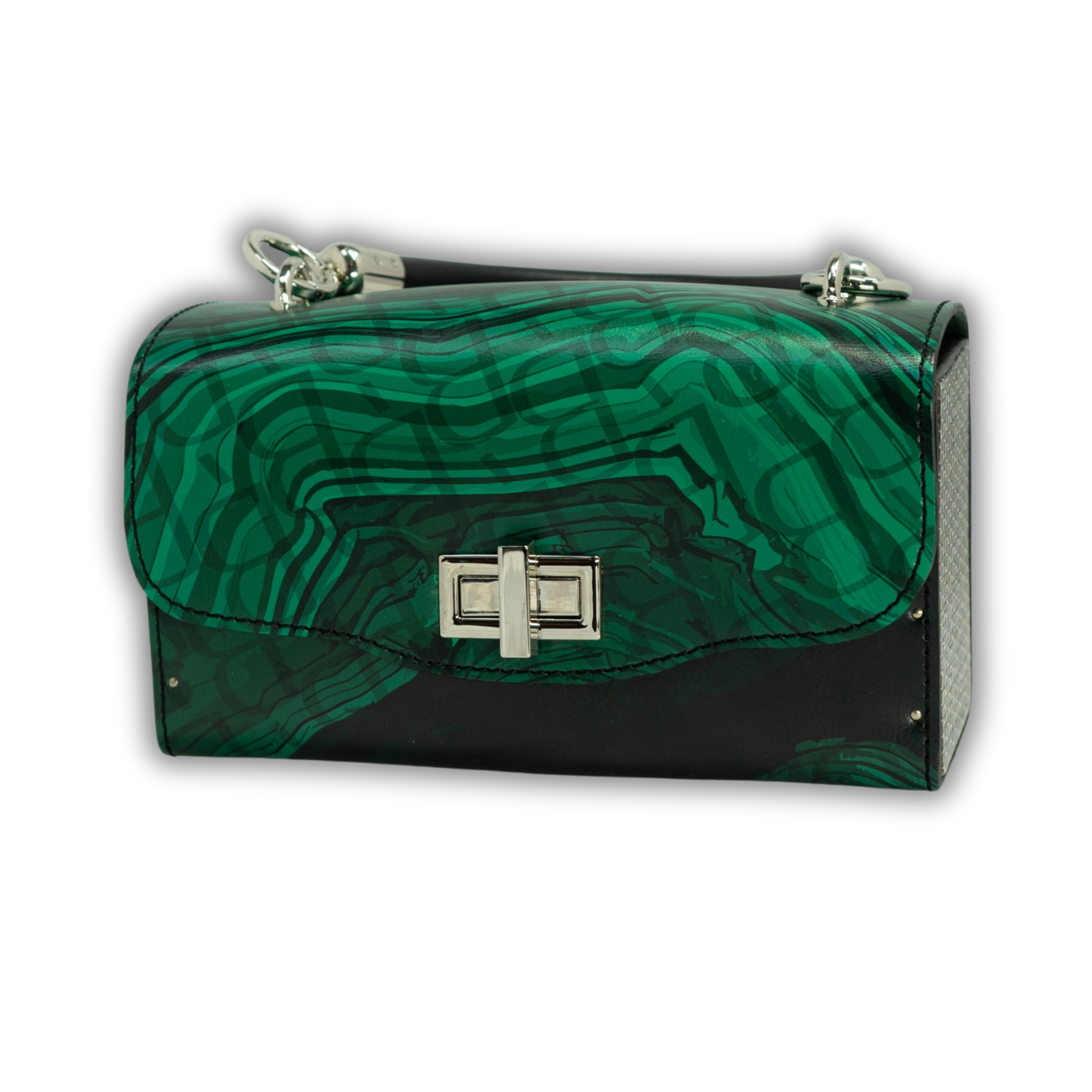 Luxury unique handbag: Genuine Leather, Natural Wood, Italian Alcantara, Malachite Stone Print, Unique Design Made from genuine leather, natural wood, and authentic Italian Alcantara, this piece features an exclusive malachite stone print. The wooden sides are adorned with a unique pattern.