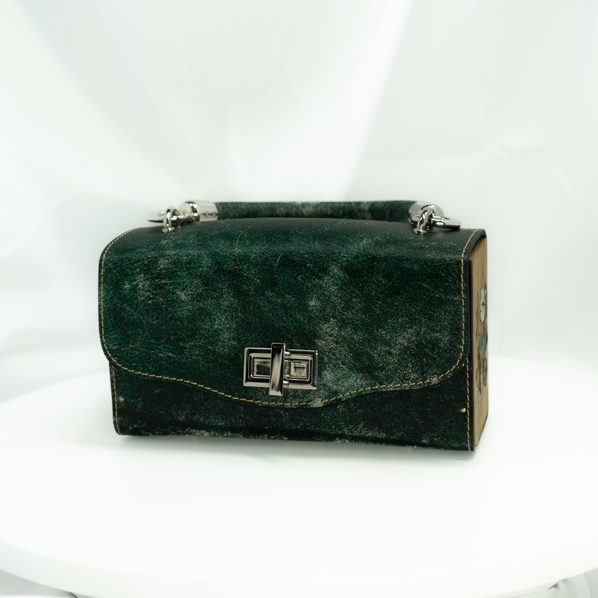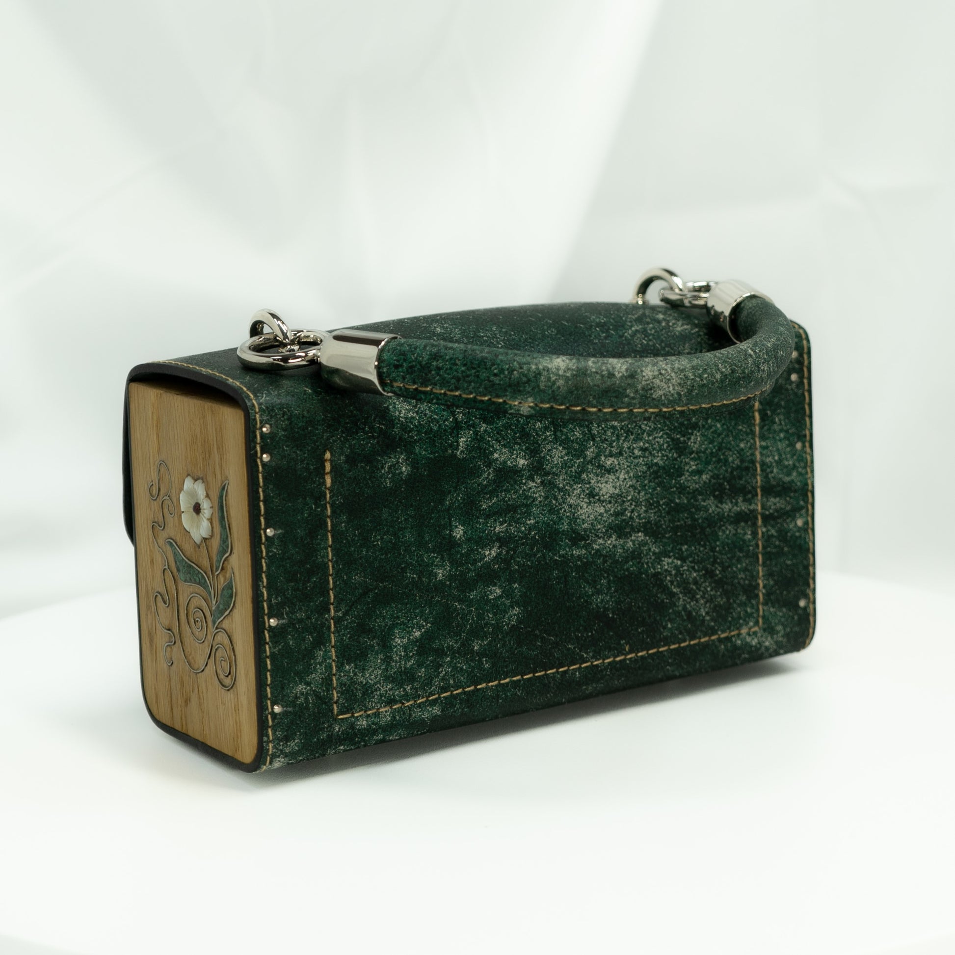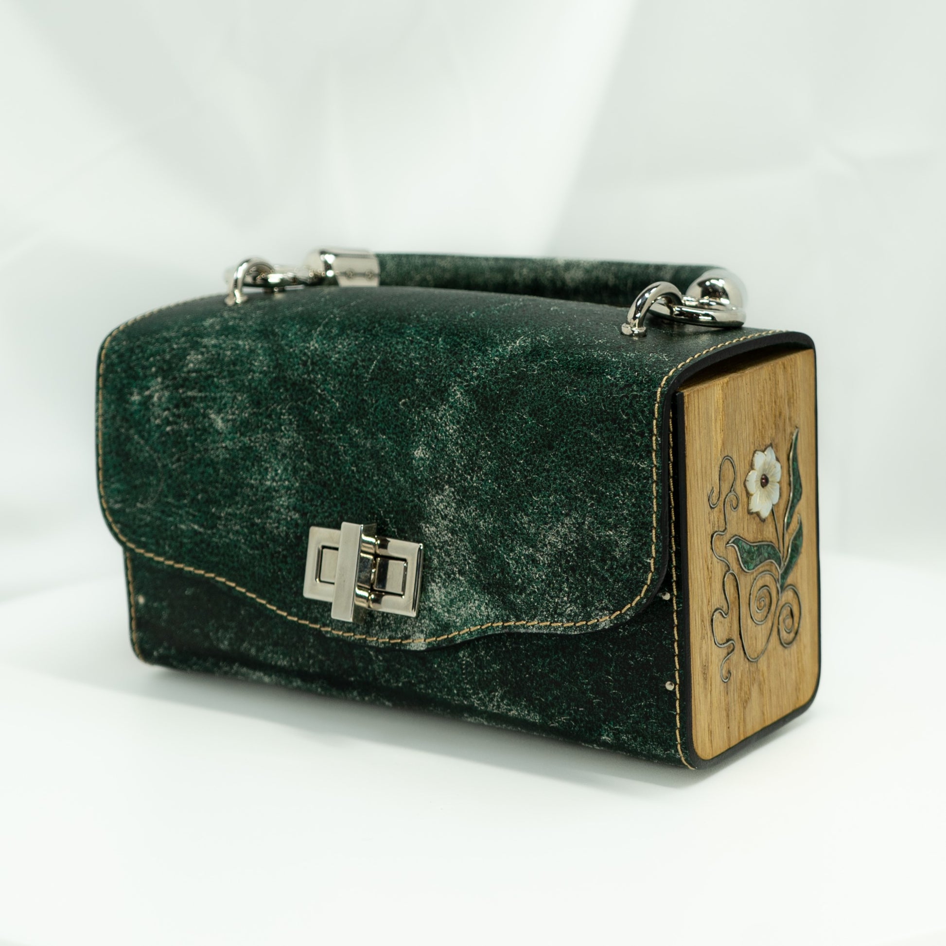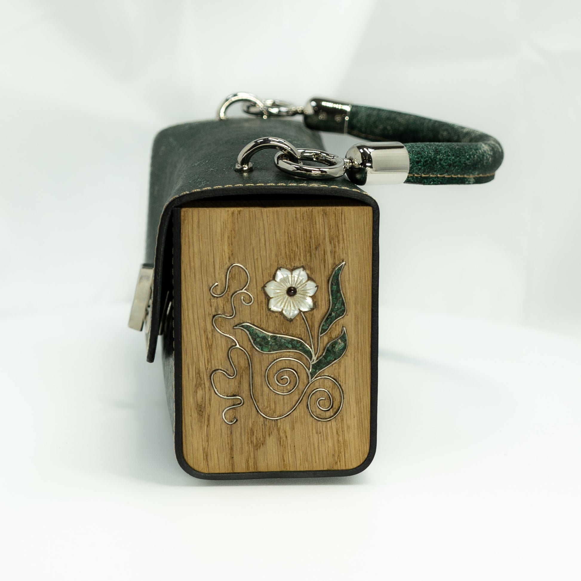 Naomi Mother-of-pearl. Green leather, wood side with mother-of-pearl flower elements