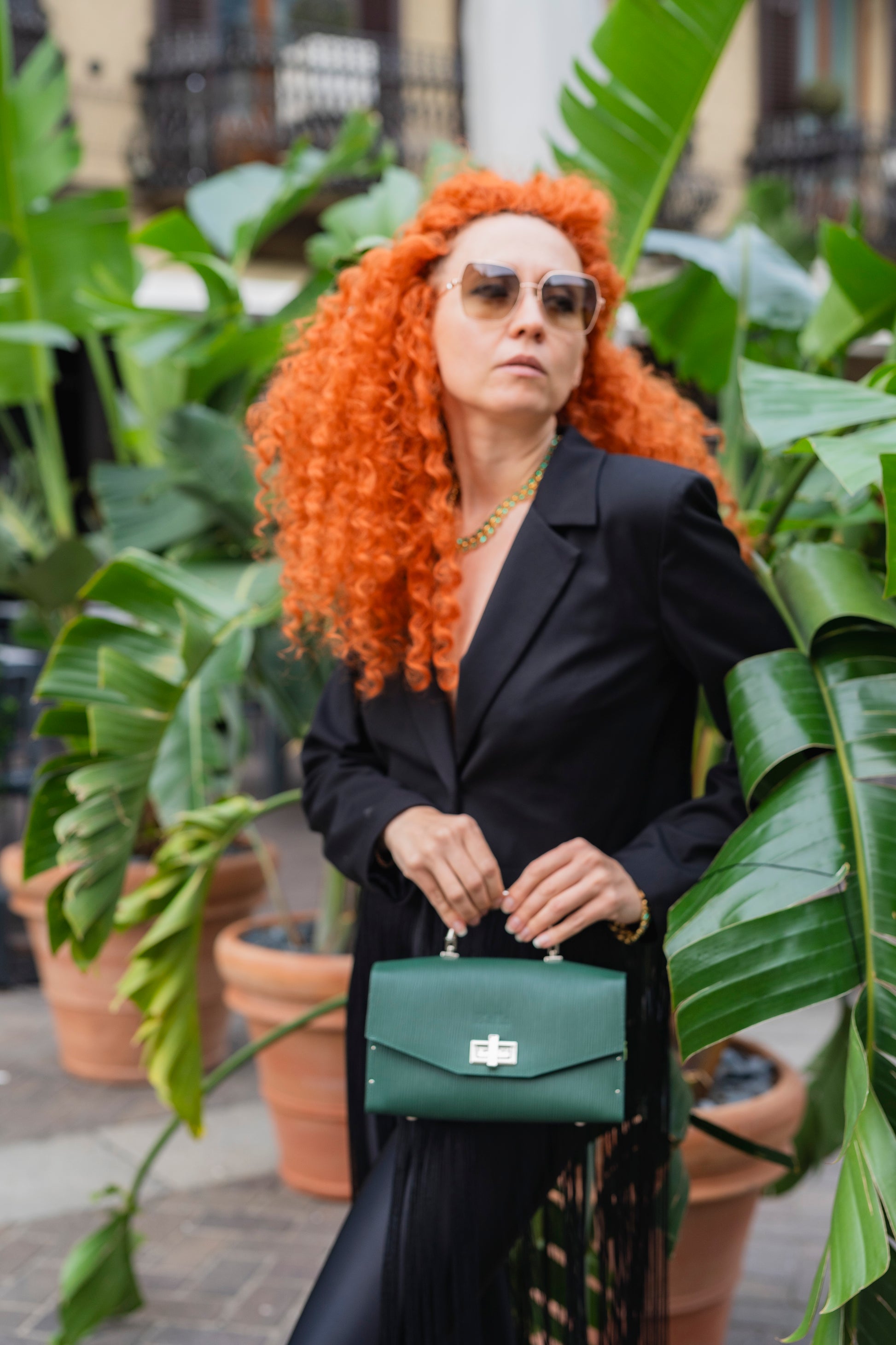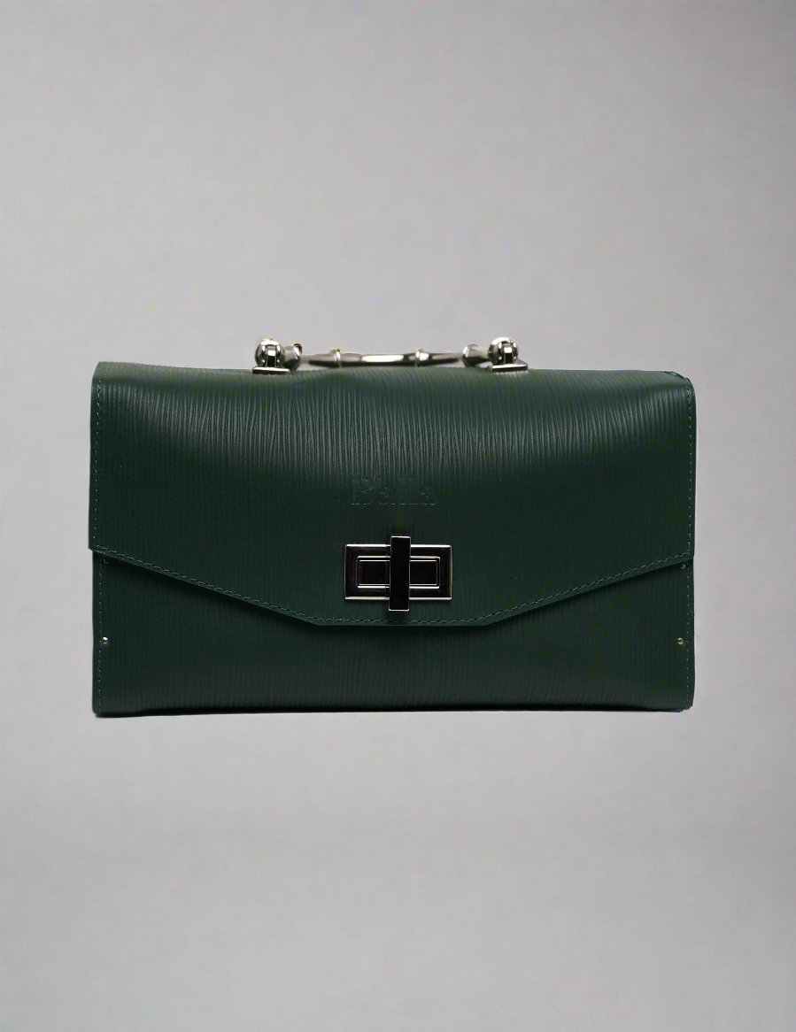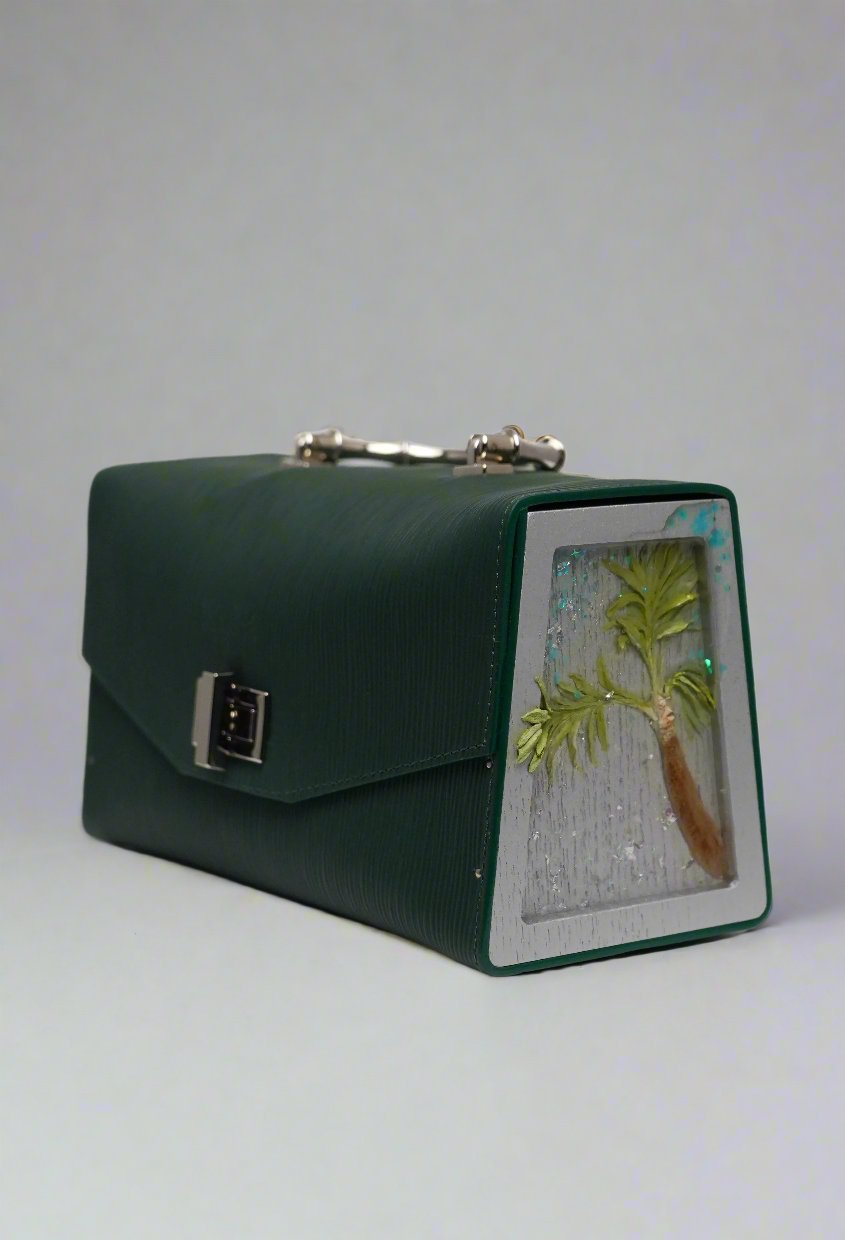 Unveil a unique blend of sophistication and nature-inspired design with the MIAMI green leather handbag. Made from premium green leather, this elegant bag is accented with a natural wood panel featuring a detailed palm tree motif, offering a touch of tropical charm. The sleek, structured silhouette is complemented by polished silver-tone hardware and a sturdy top handle, adding a modern edge to the overall look. The palm tree is crafted with intricate detail, giving the design a naturalistic, handcrafted feel.