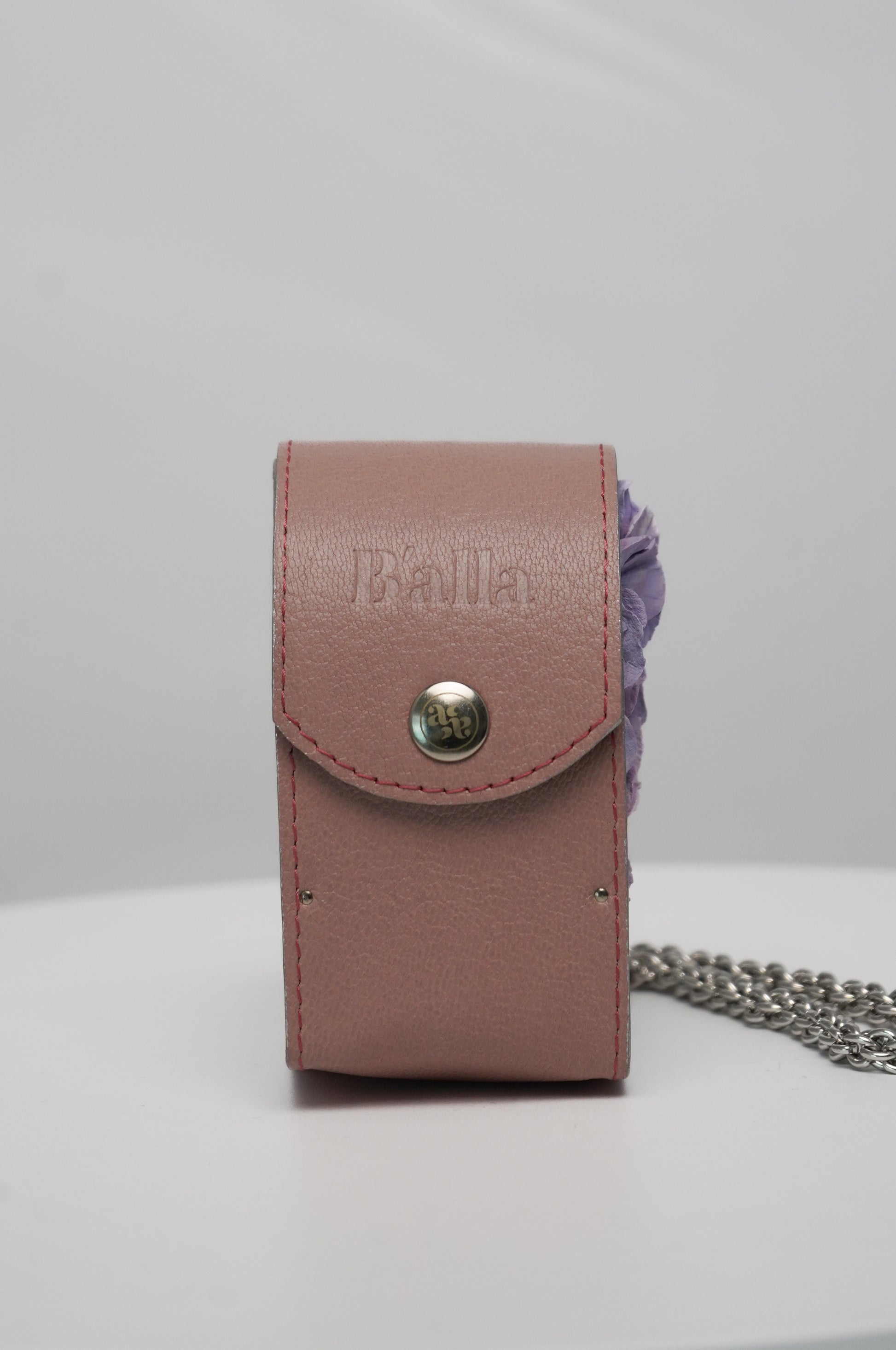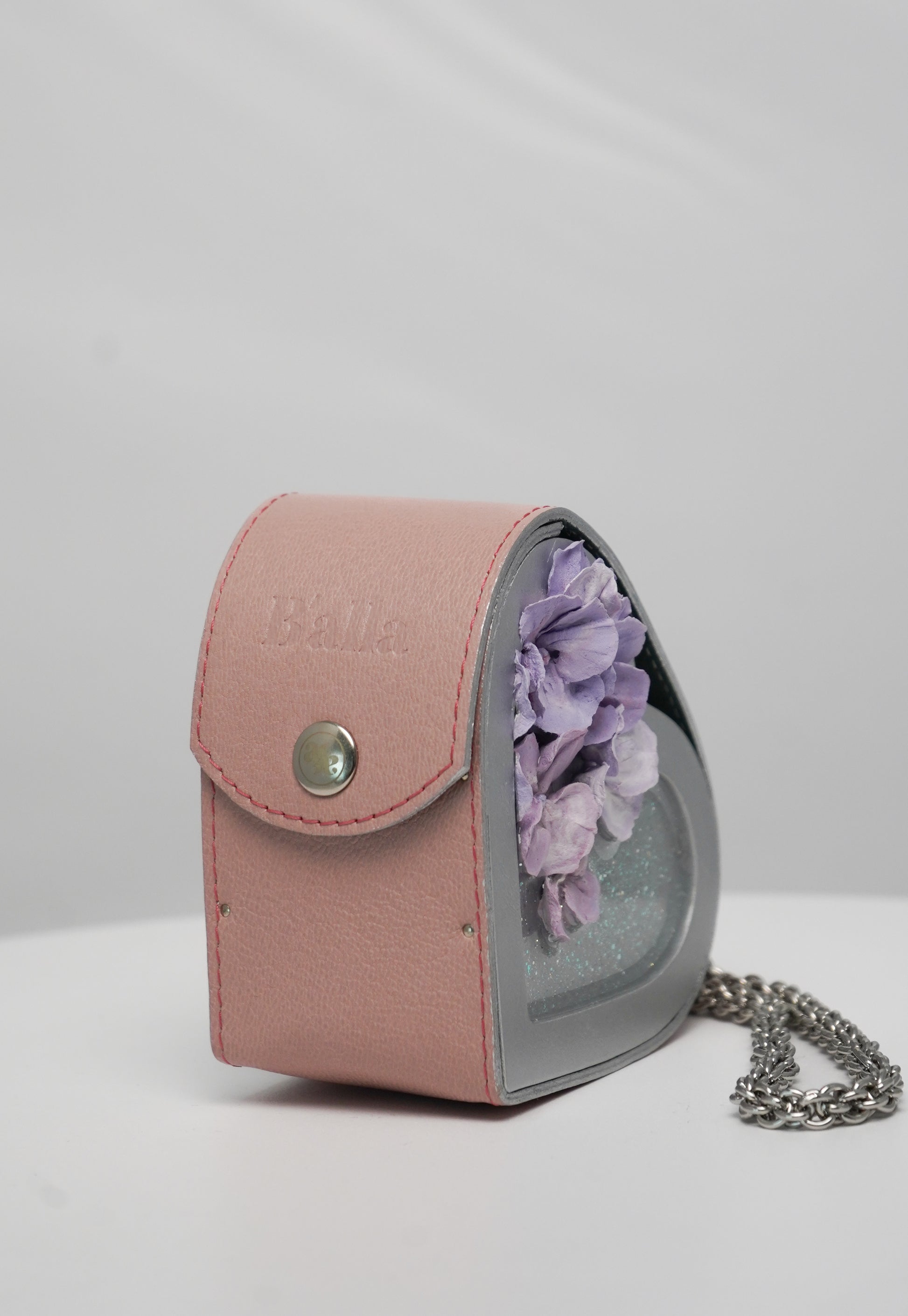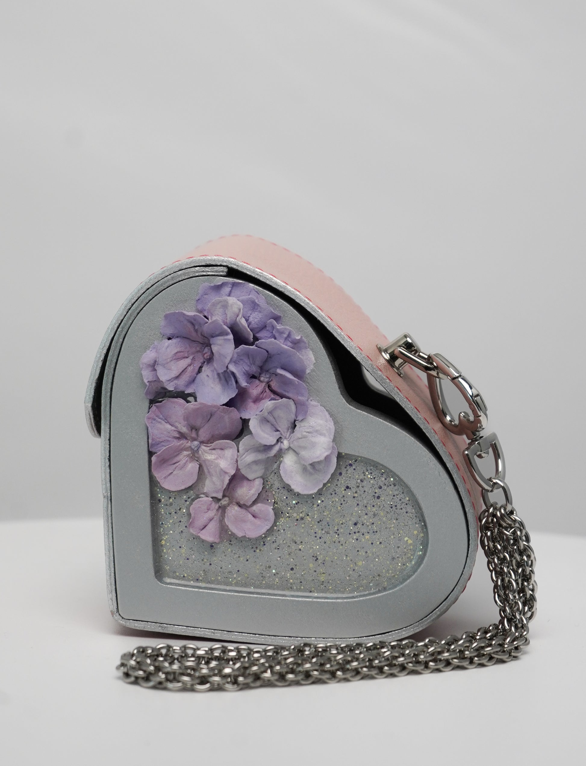 Embrace the charm of this delicate and stylish mini bag, crafted from soft pink leather for a feminine and sophisticated look. The structured design features a unique transparent heart-shaped side panel, filled with beautiful lavender-hued flowers, giving the bag an enchanting and romantic touch. Its compact size is ideal for carrying essentials, while the silver-tone snap button closure and chain strap add a modern edge to the whimsical aesthetic.