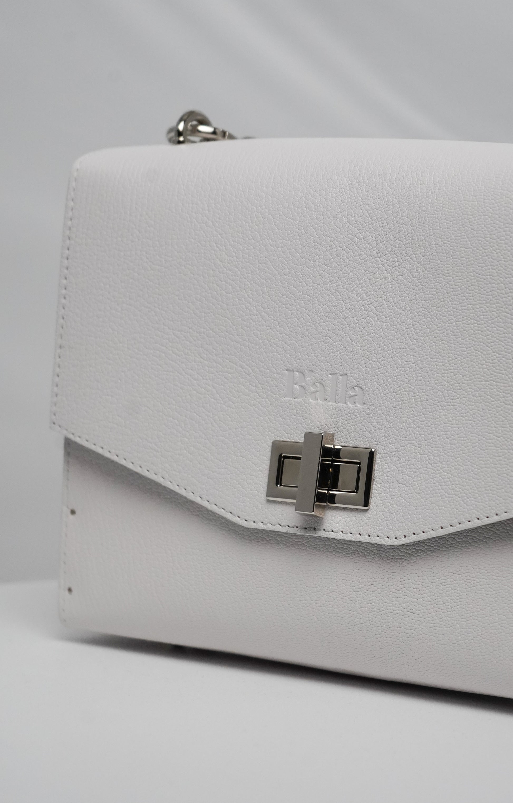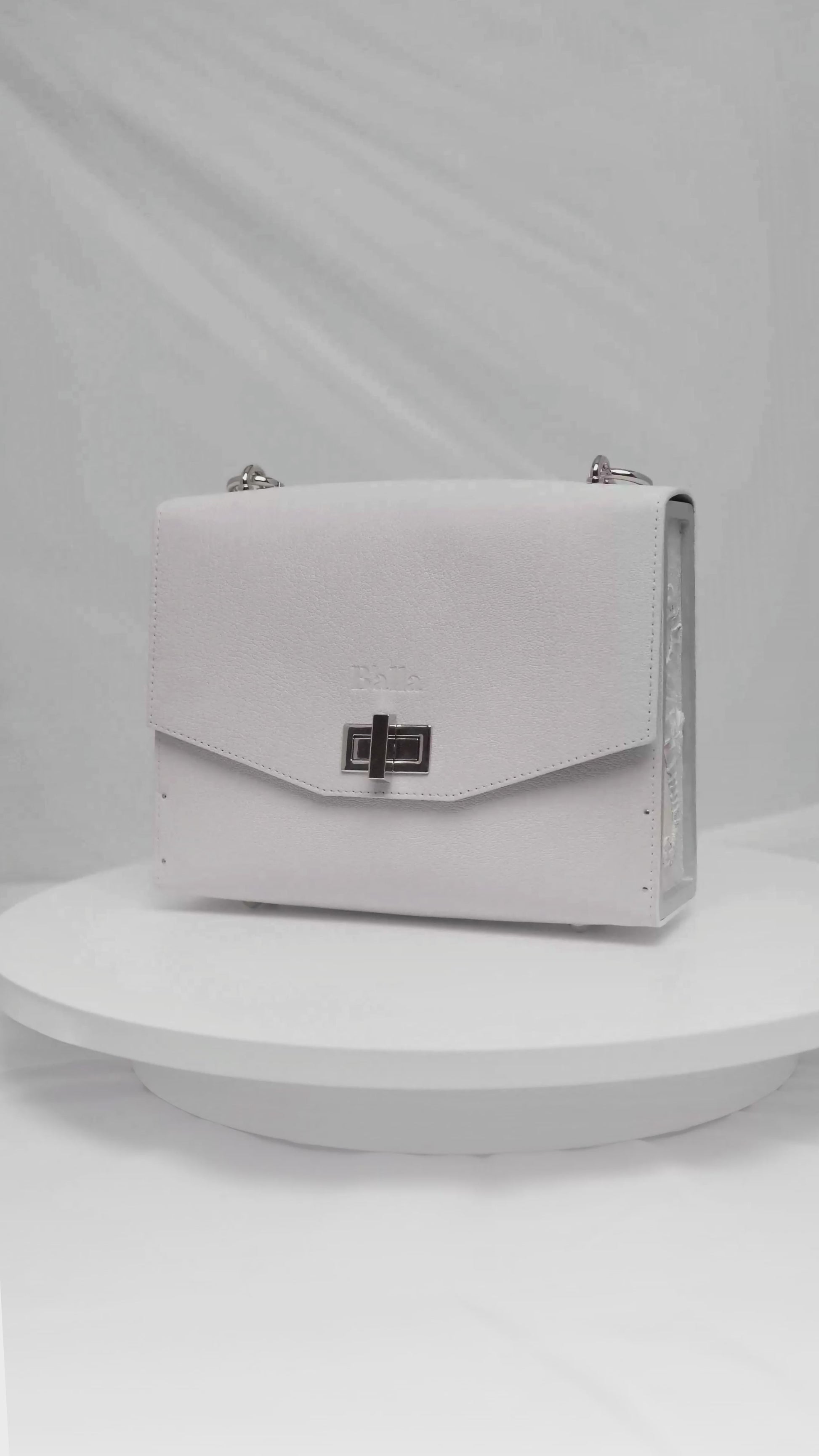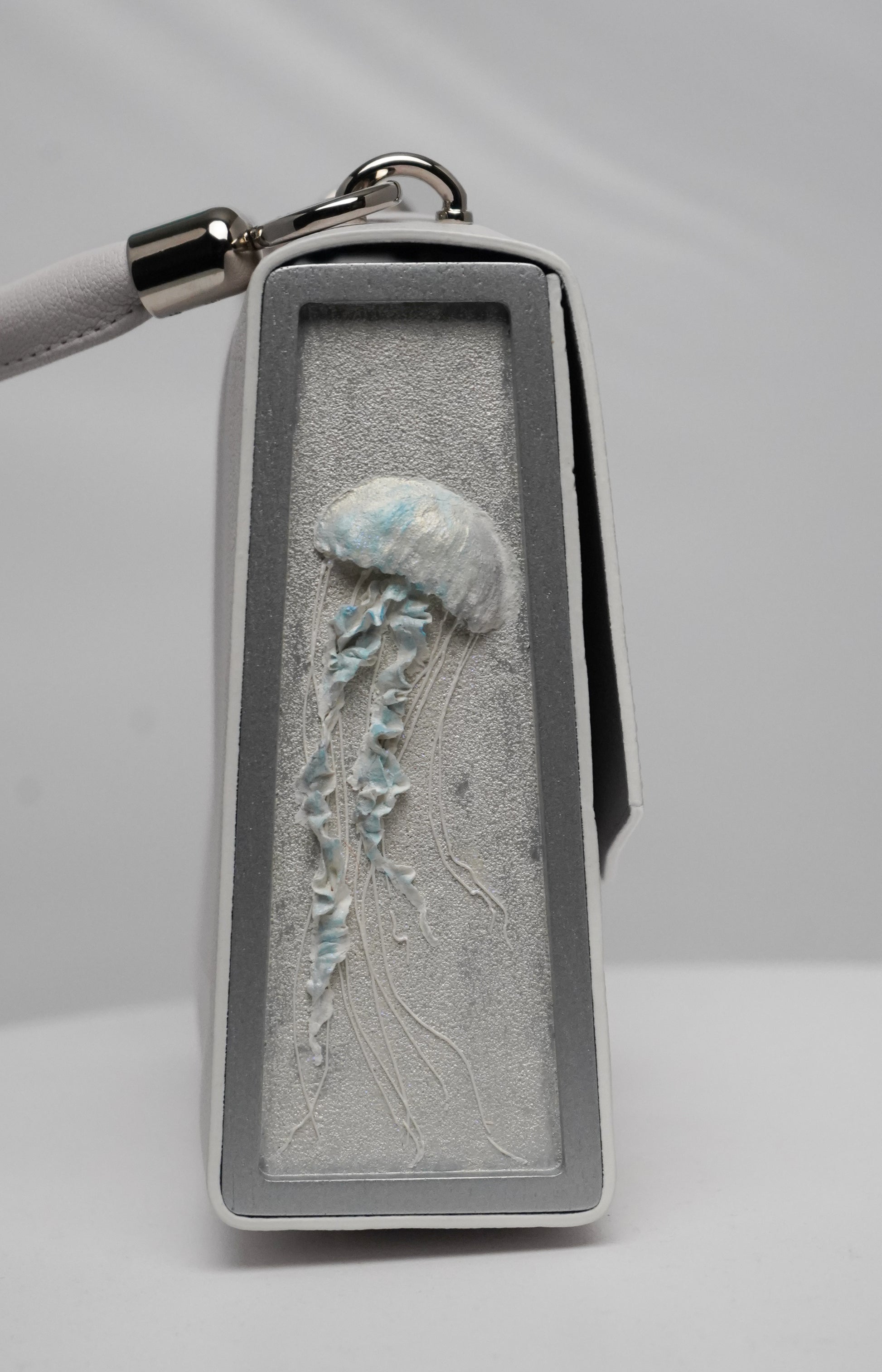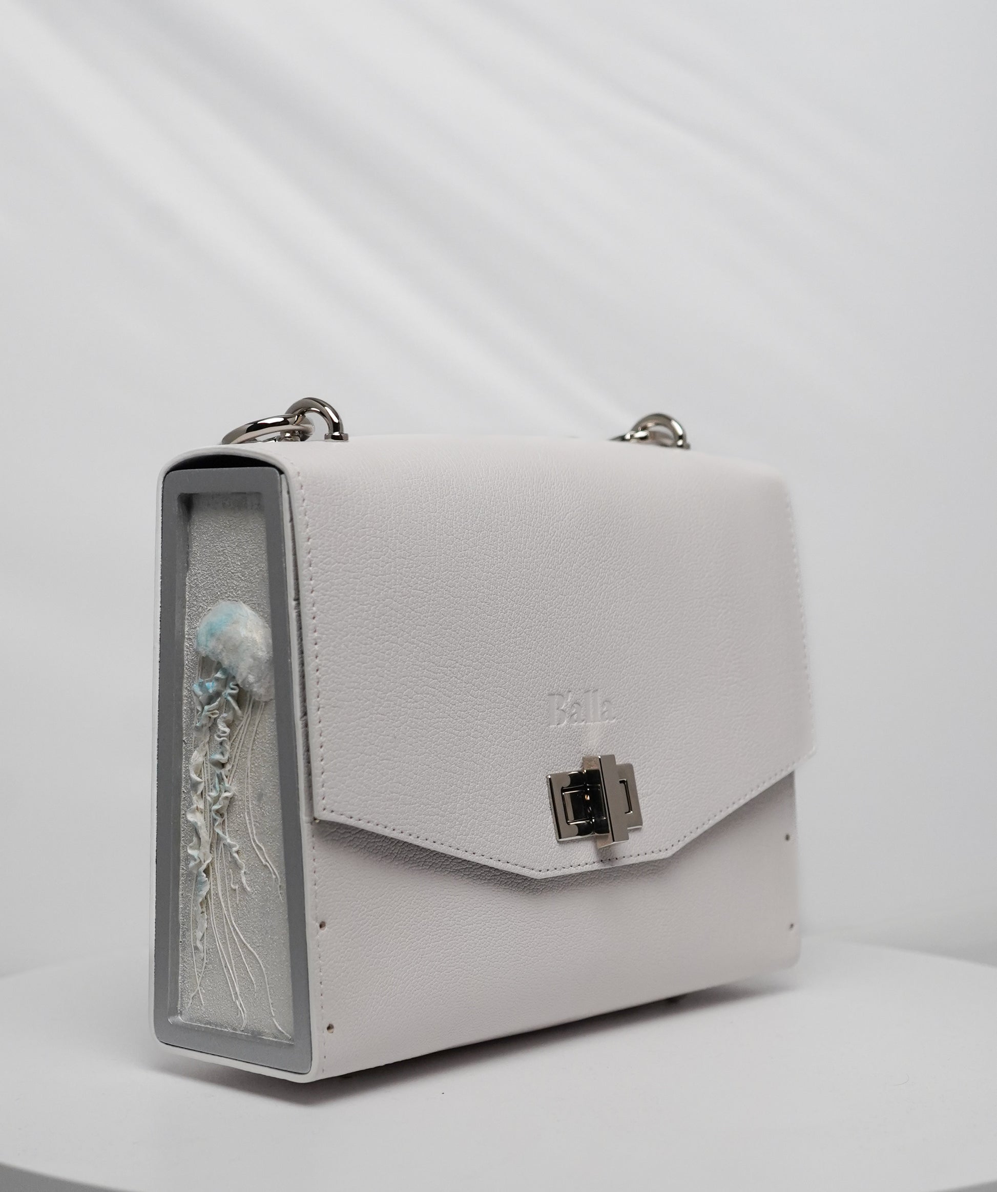 The Rebeca bag is a refined accessory that combines elegance with artistic flair. Crafted from premium white leather, it features unique wooden side panels showcasing delicate, handcrafted inlays resembling ethereal jellyfish, adding a whimsical touch to its sophisticated design. With polished silver-tone hardware and a chic chain strap, the Rebeca bag is perfect for adding a graceful yet unique accent to any outfit.