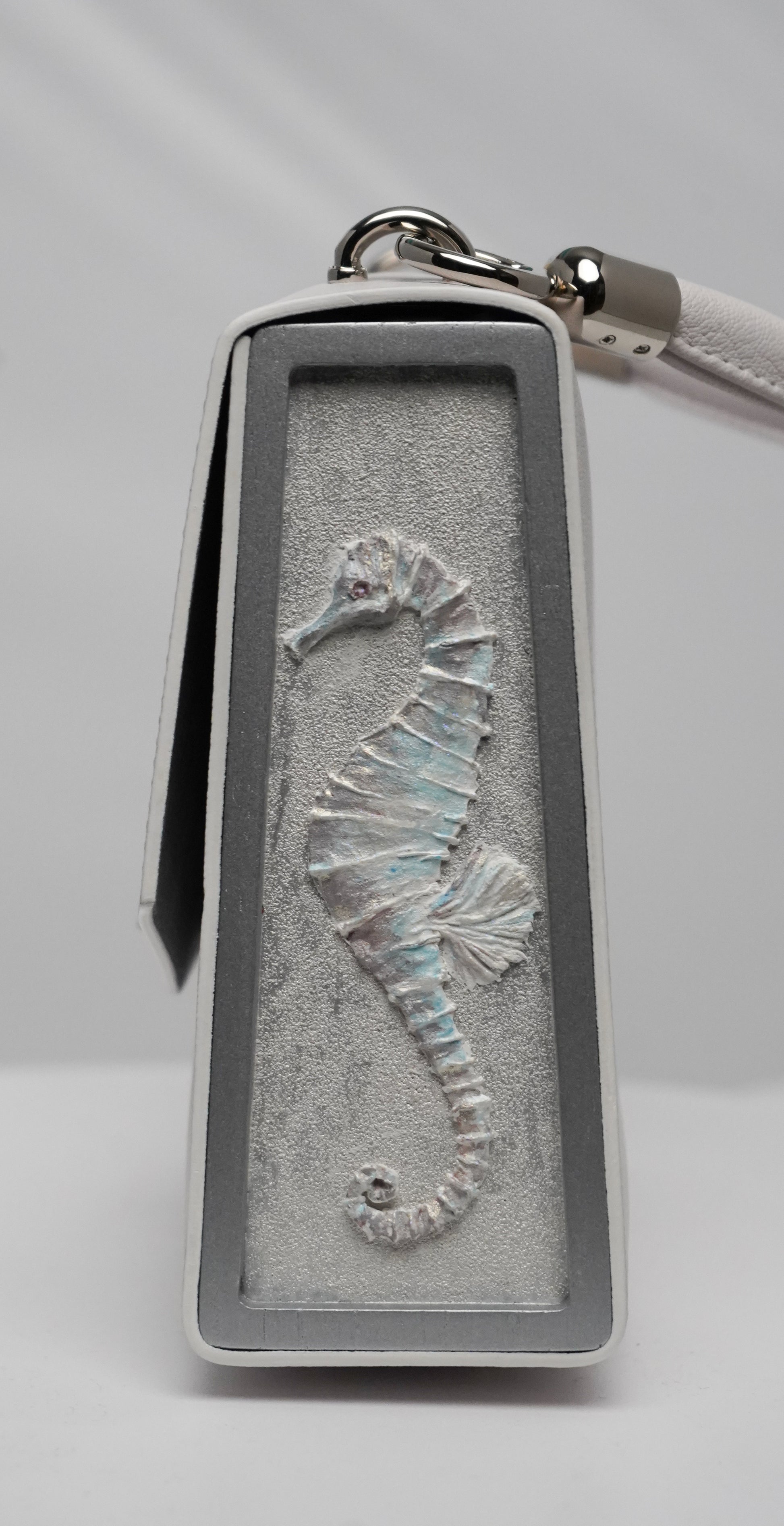 Rebeca White Leather Bag with Artistic Wood Inlay and Marine Design