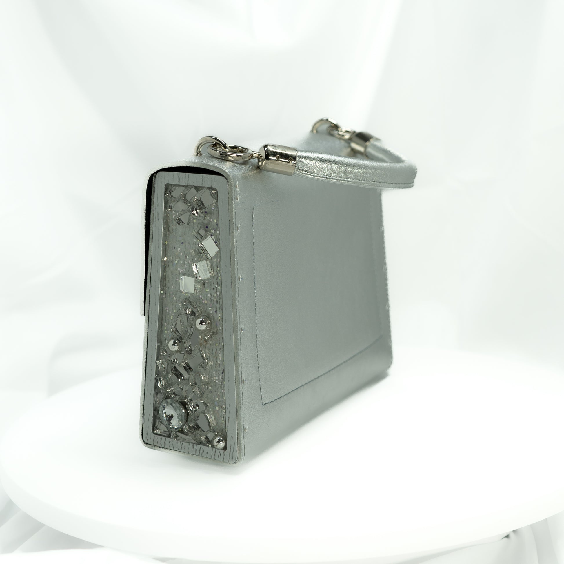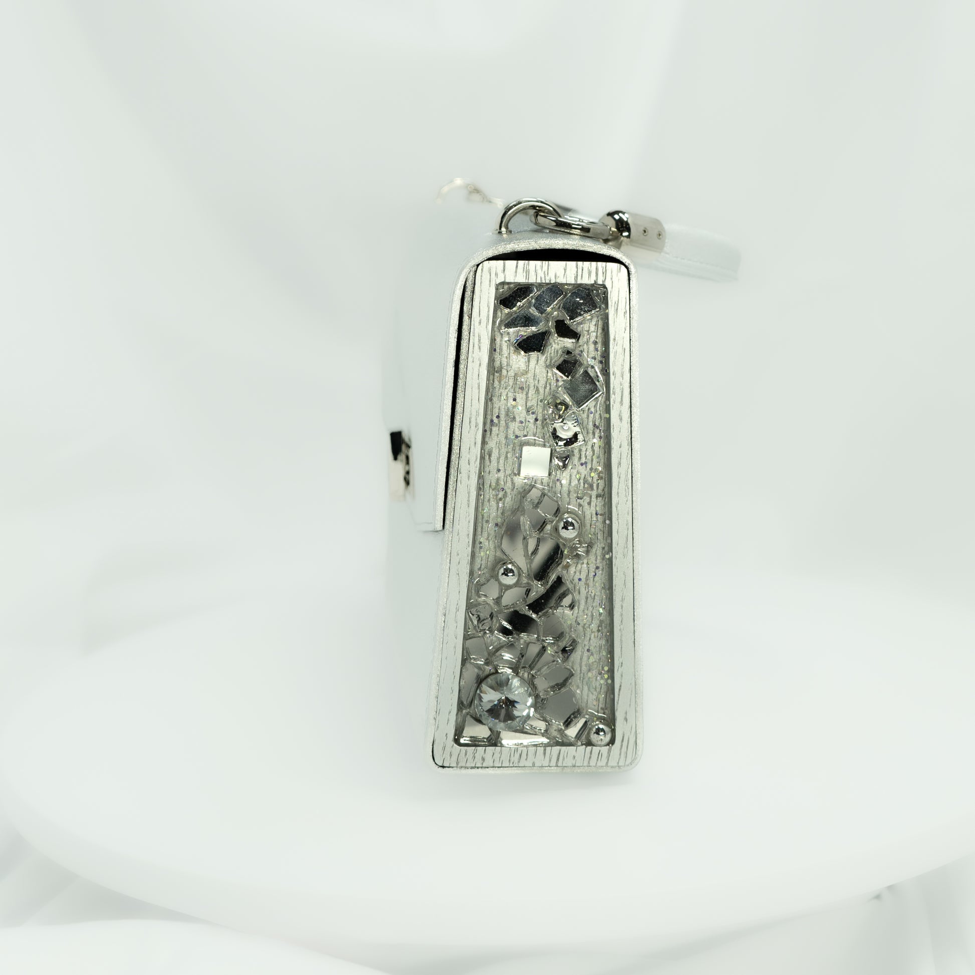 Introducing our exquisite evening bag, crafted from genuine silver leather with a luxurious Italian Alcantara lining. The sides feature inserts of American oak, beautifully adorned with silver glitter embedded in resin. This bag is the perfect blend of elegance and sophistication, making it a standout accessory for any special occasion.