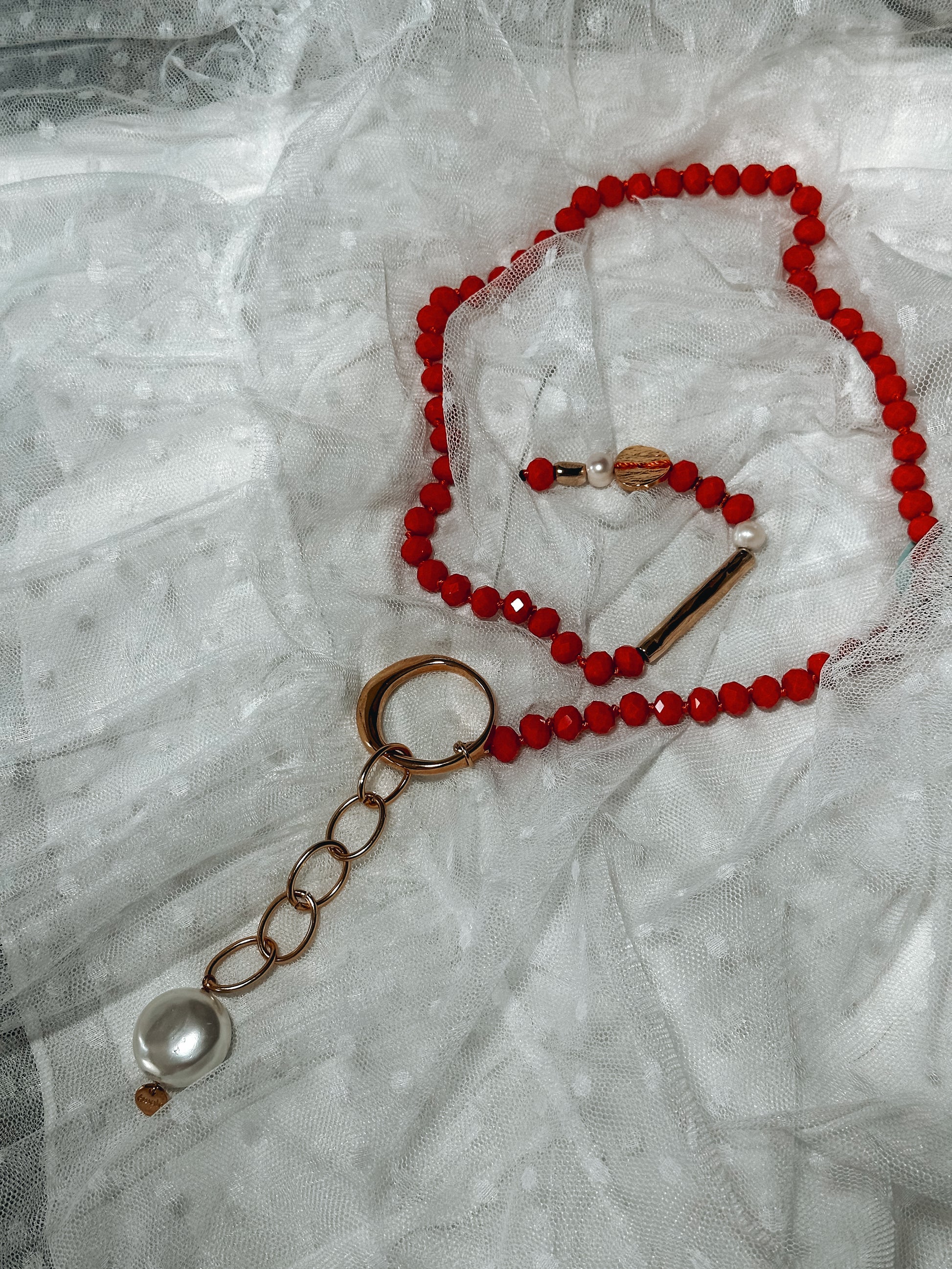 Featuring vibrant red faceted Russian crystals, this necklace captures light beautifully while adding a pop of color and energy to any look. The design is elevated with a gold-tone textured ring pendant, an elegant chain drop, and a striking oversized pearl that brings sophistication and grace to the piece.