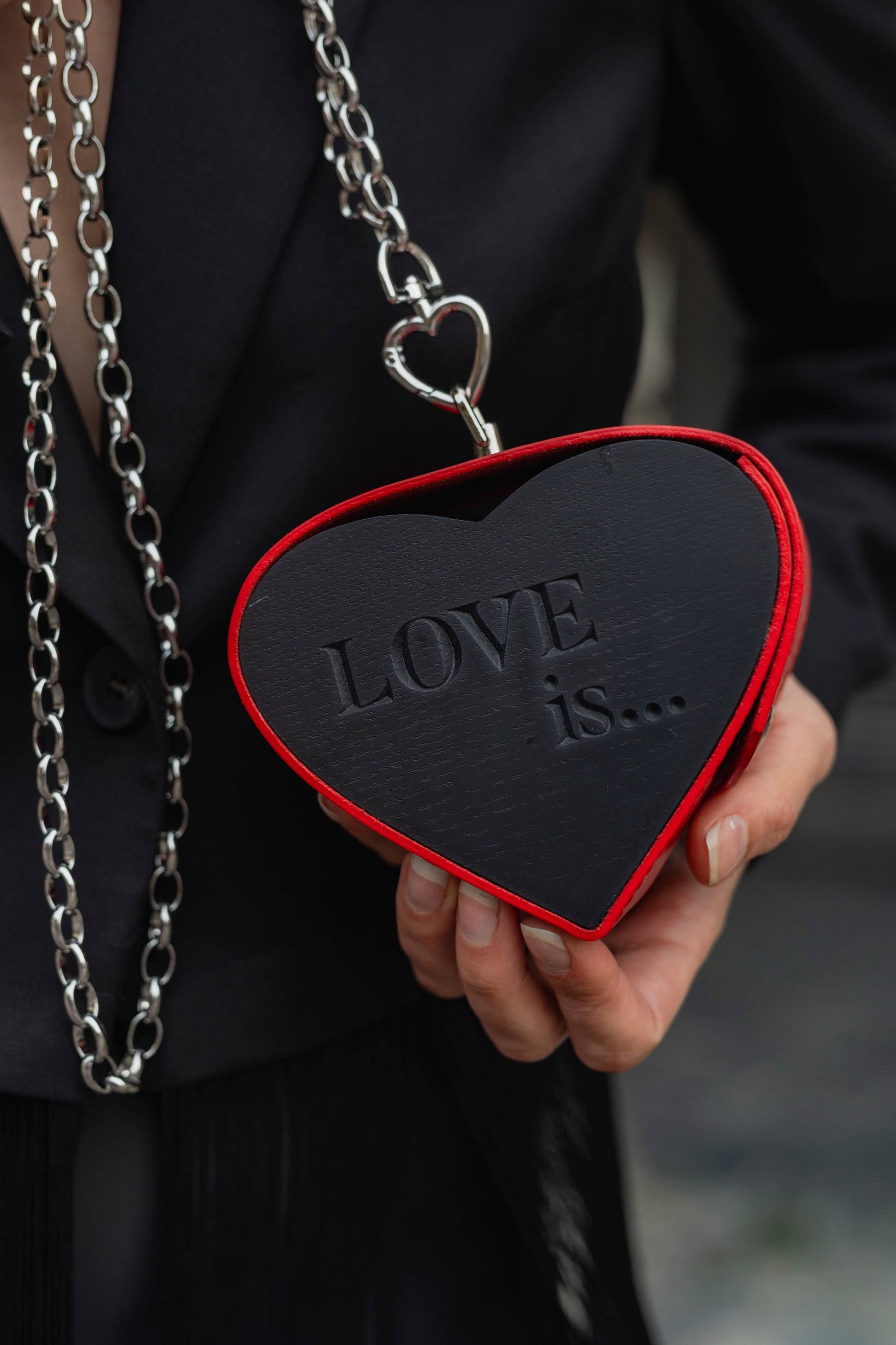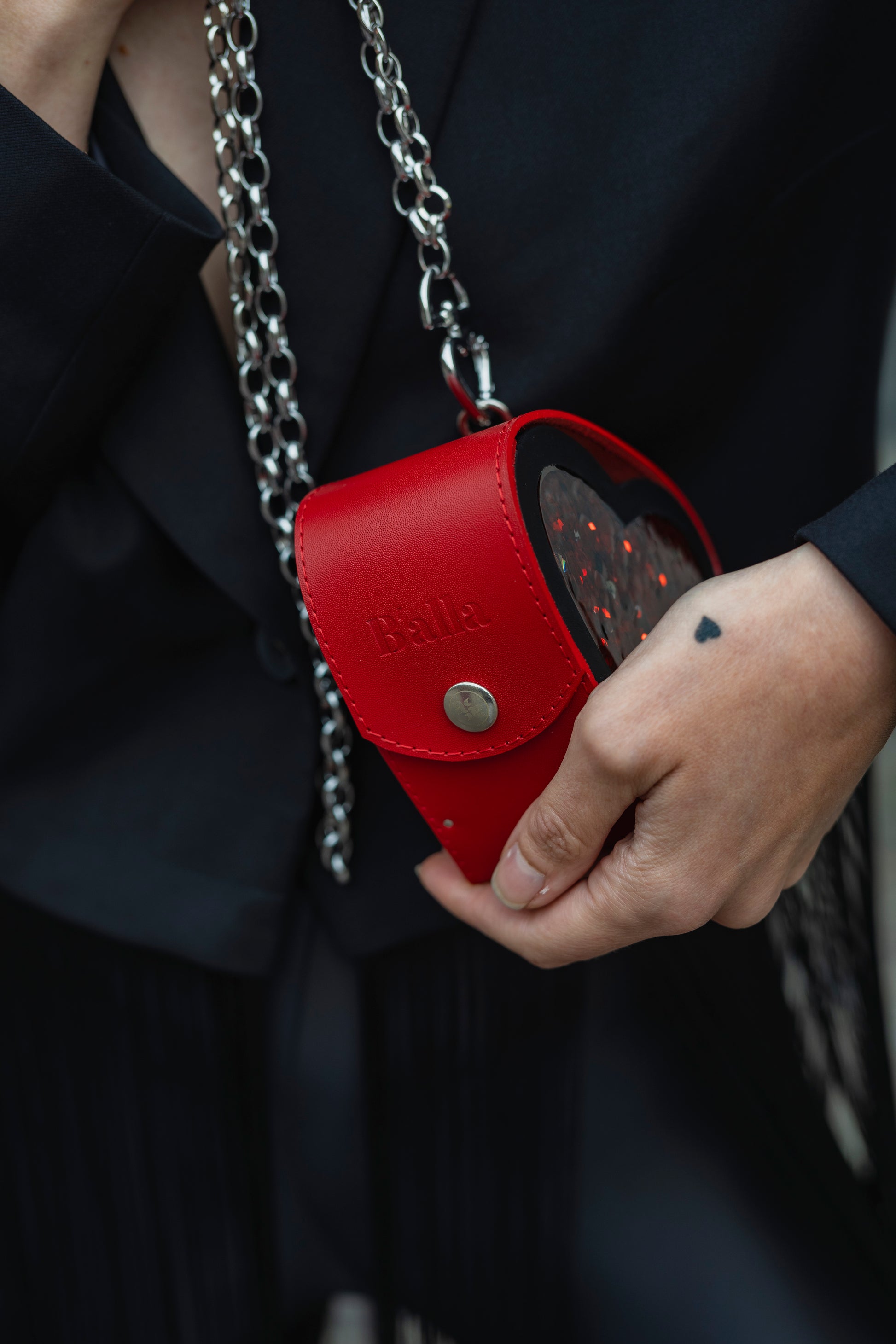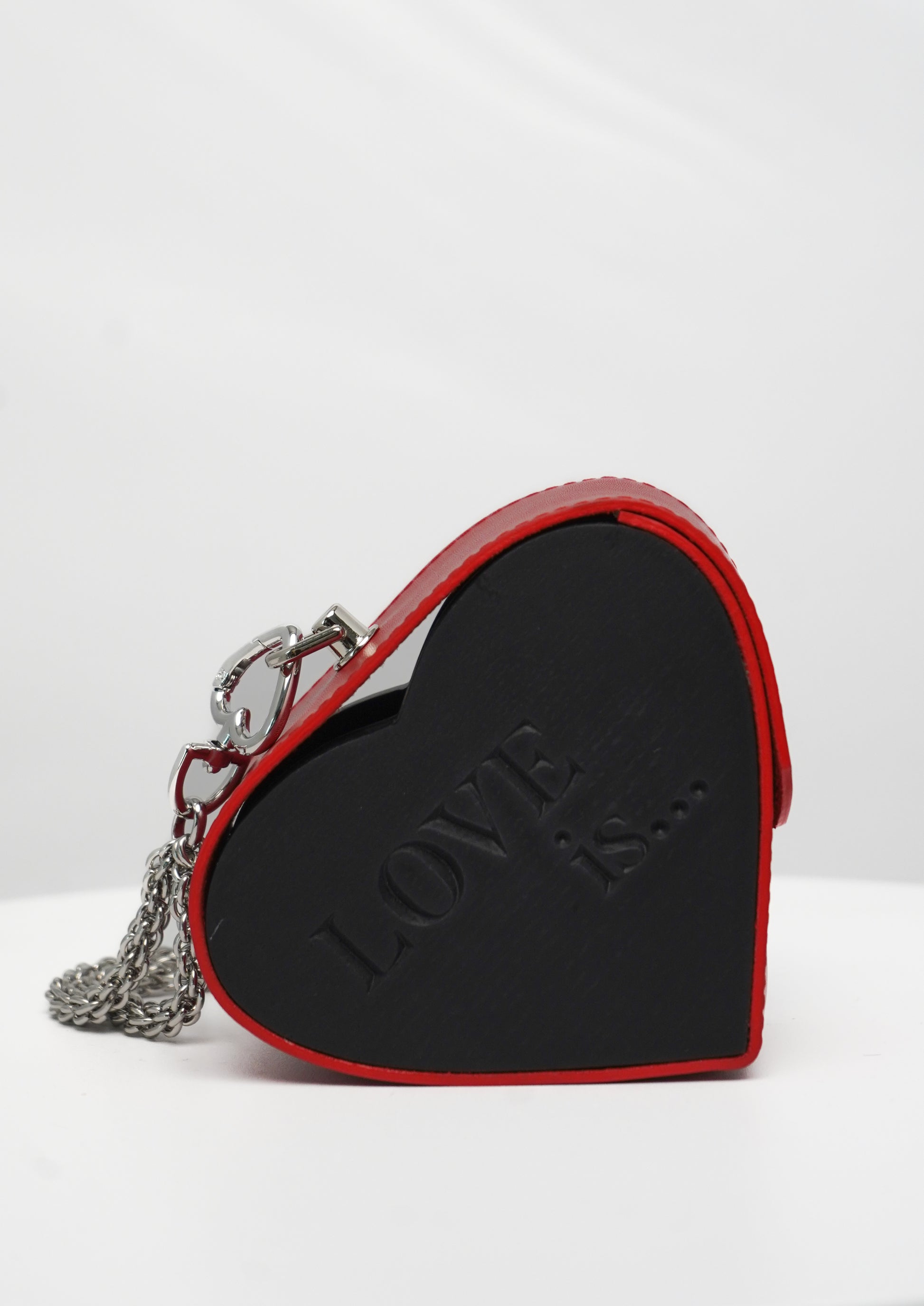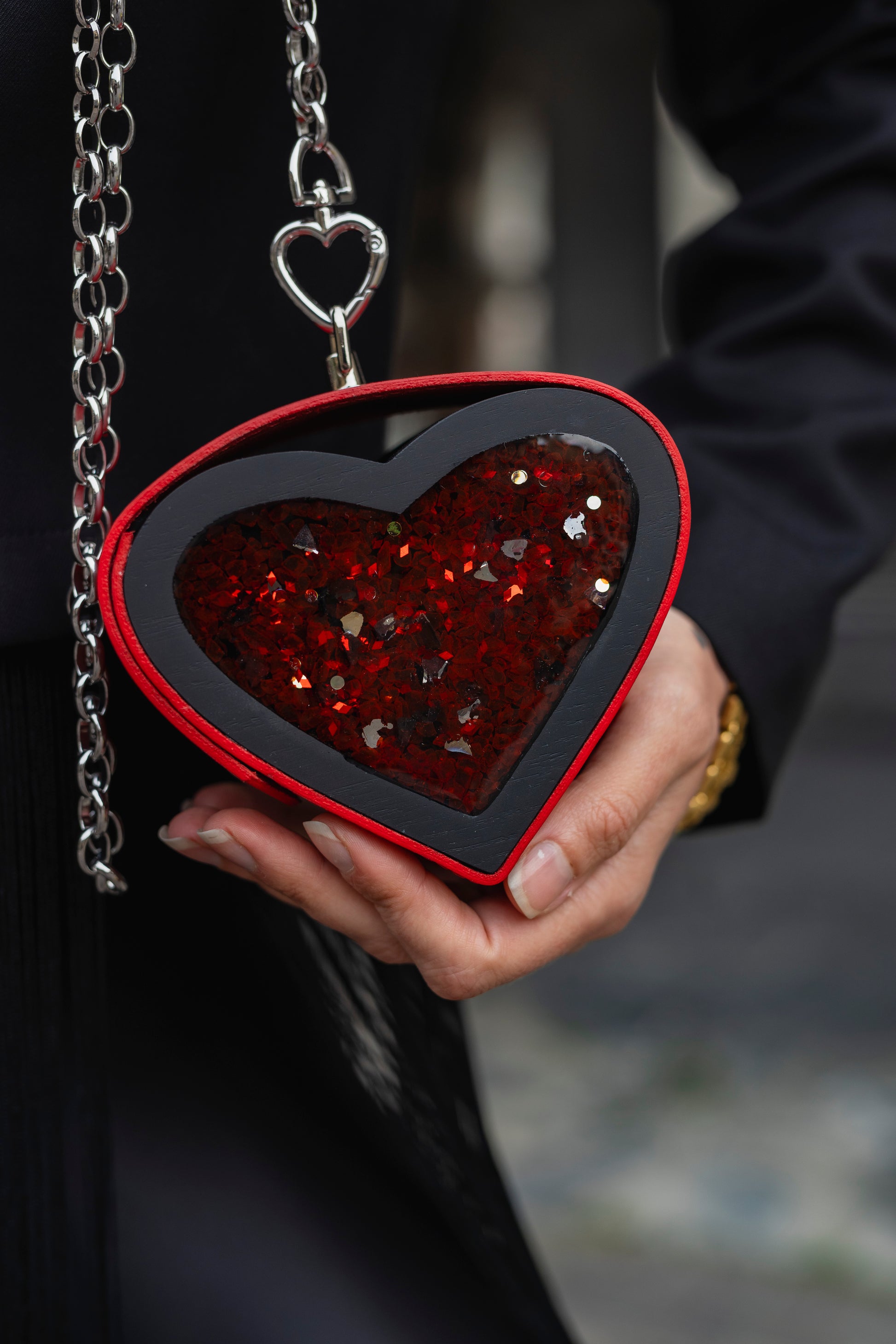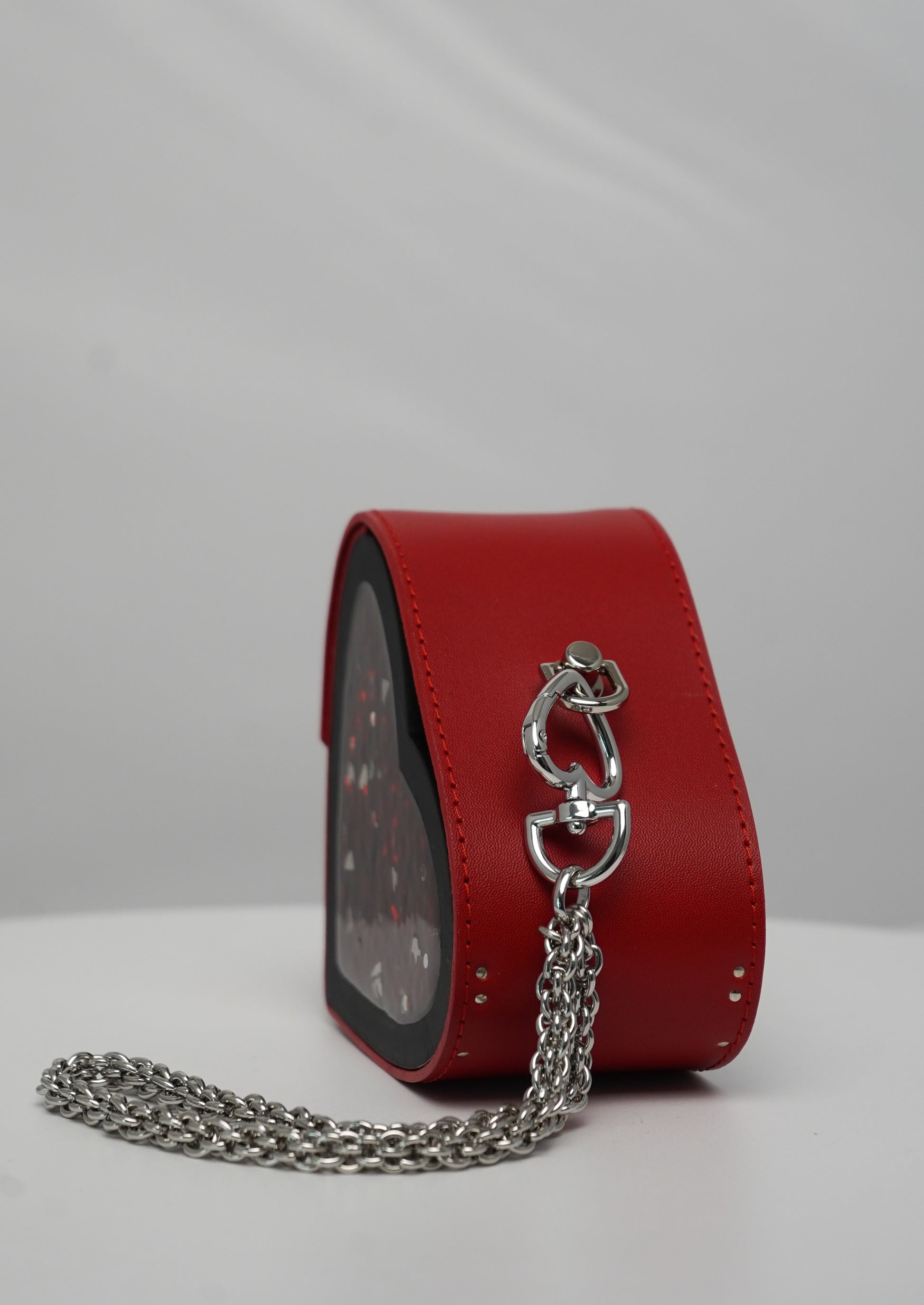 💠 Material: Smooth red leather with a heart-shaped side panel filled with glitter;