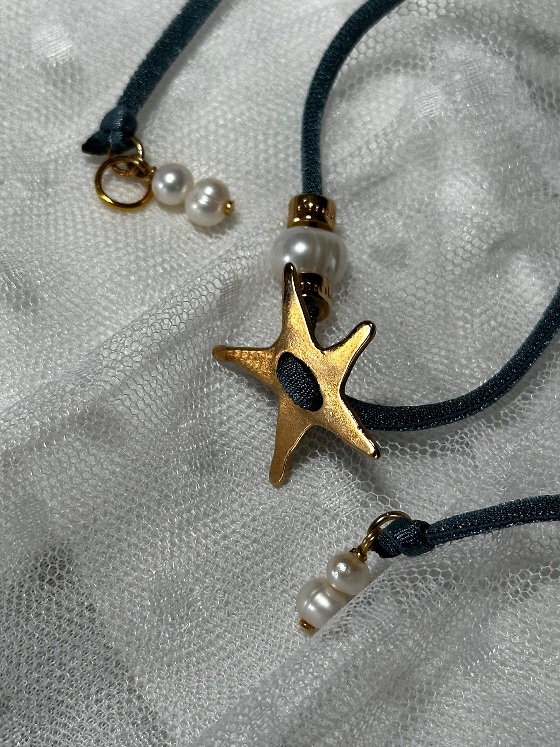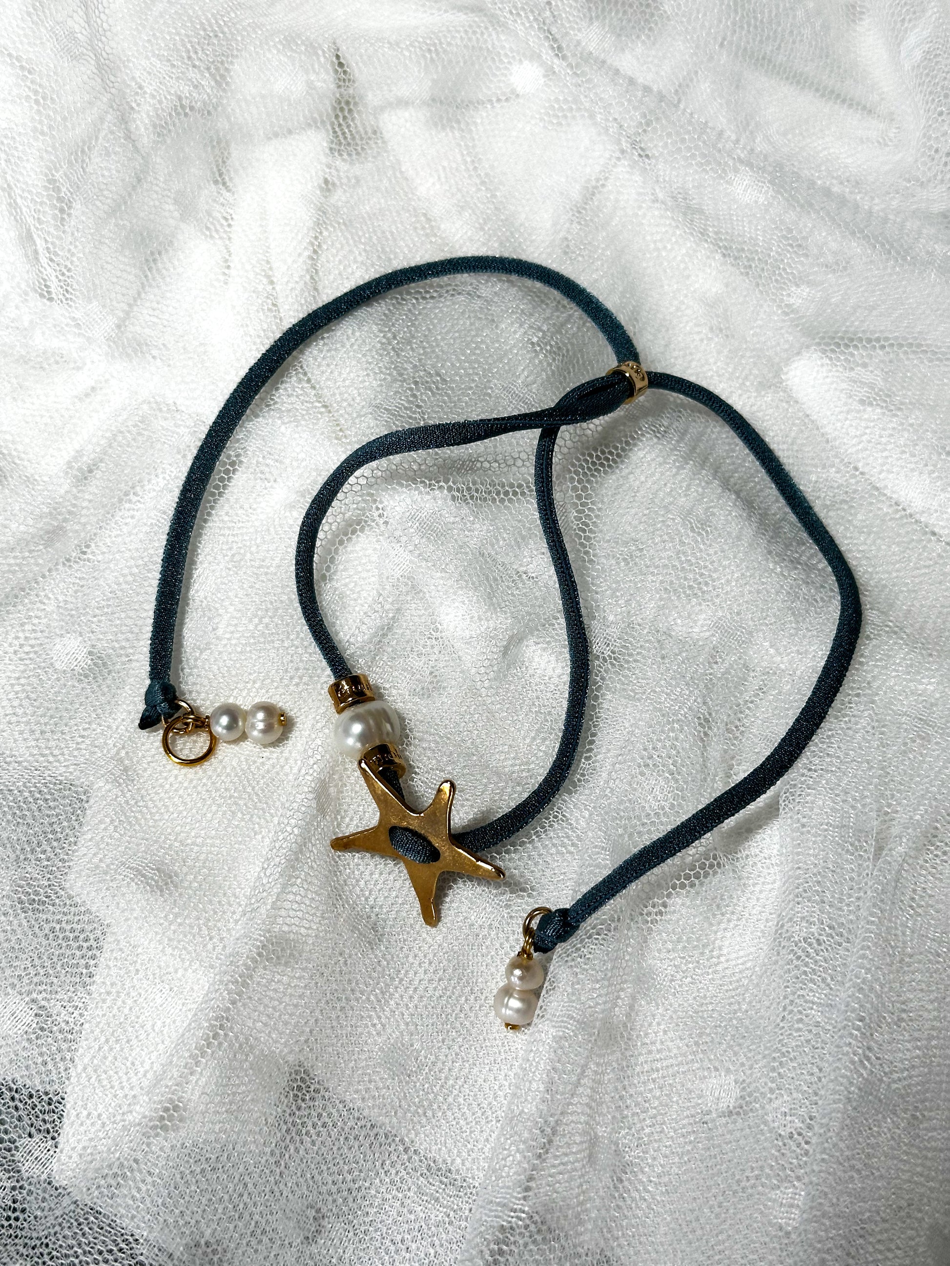 Designed to be worn as either a bracelet or a choker necklace, this piece features a soft and elegant petrol blue cord — a deep, sophisticated blue that evokes the colors of the ocean. The design is elevated with a gold-tone starfish charm, symbolizing renewal and connection to the sea, along with delicate off-white natural pearls that add a timeless, feminine touch.