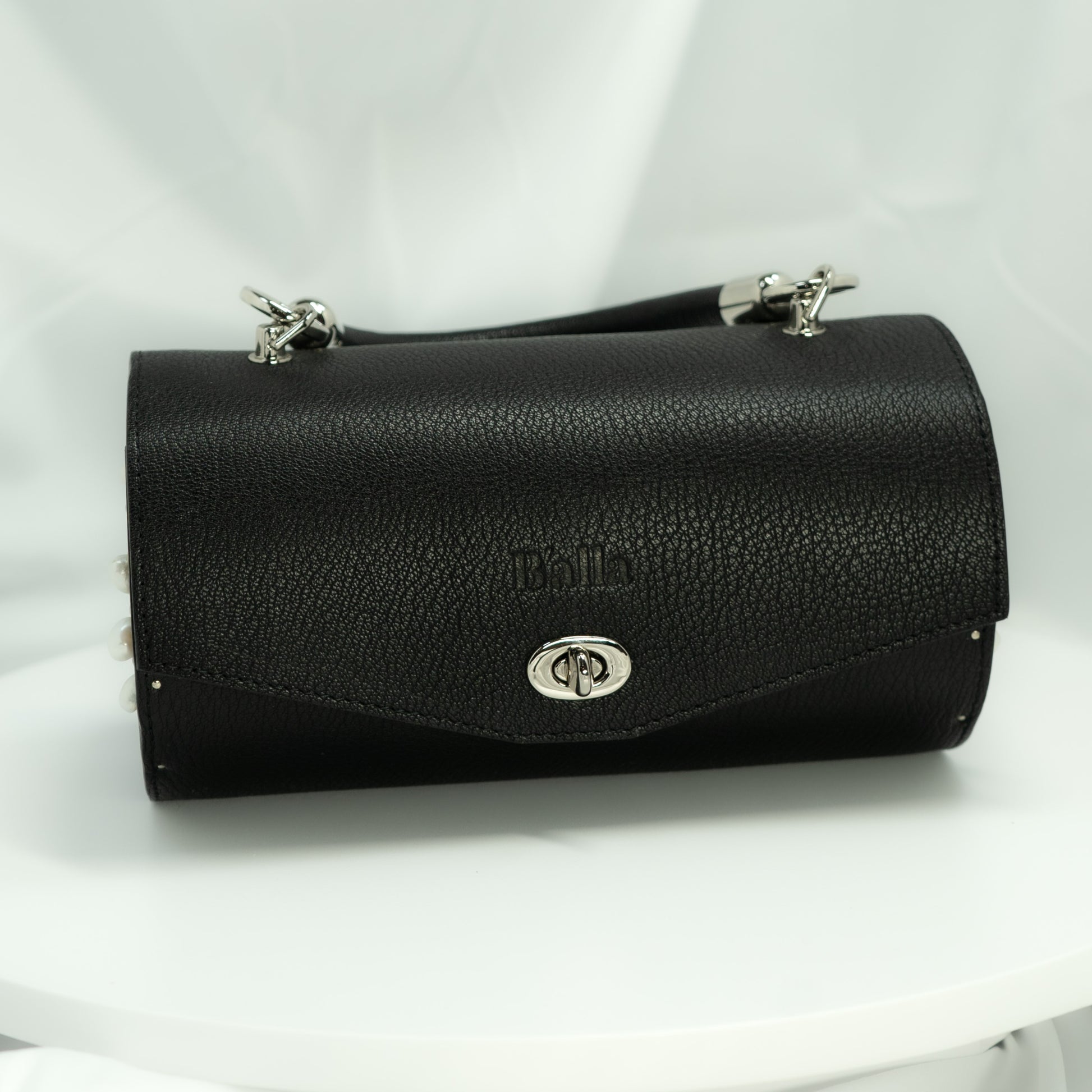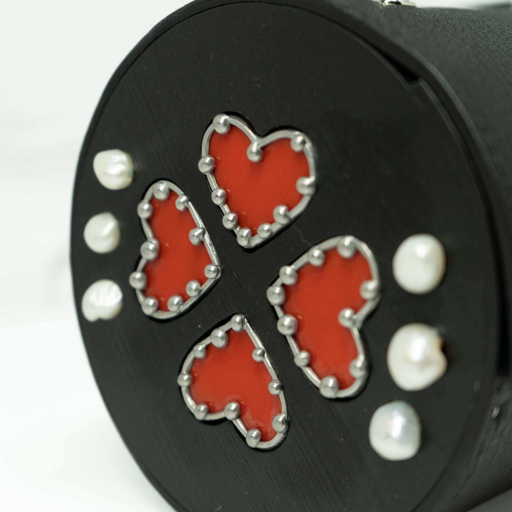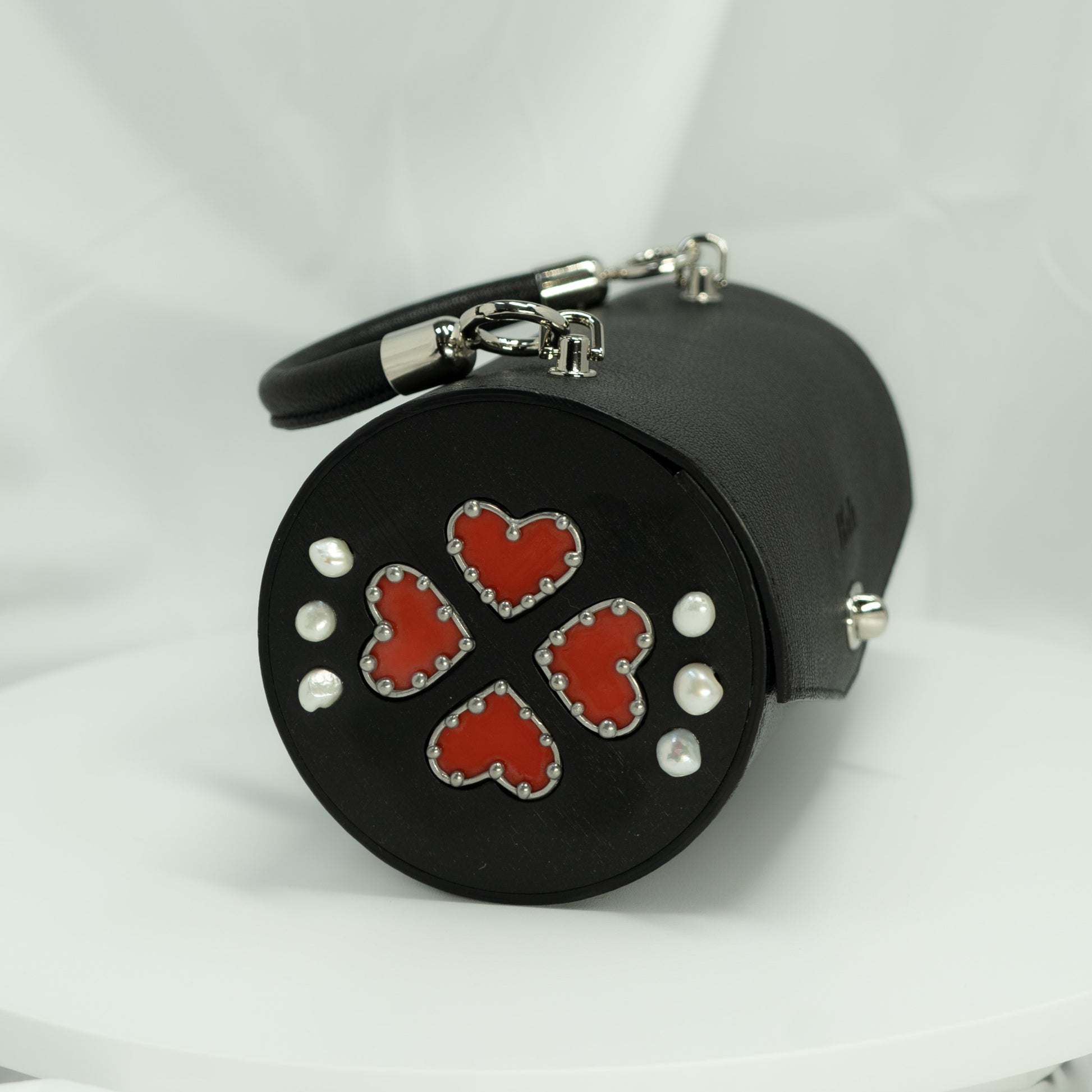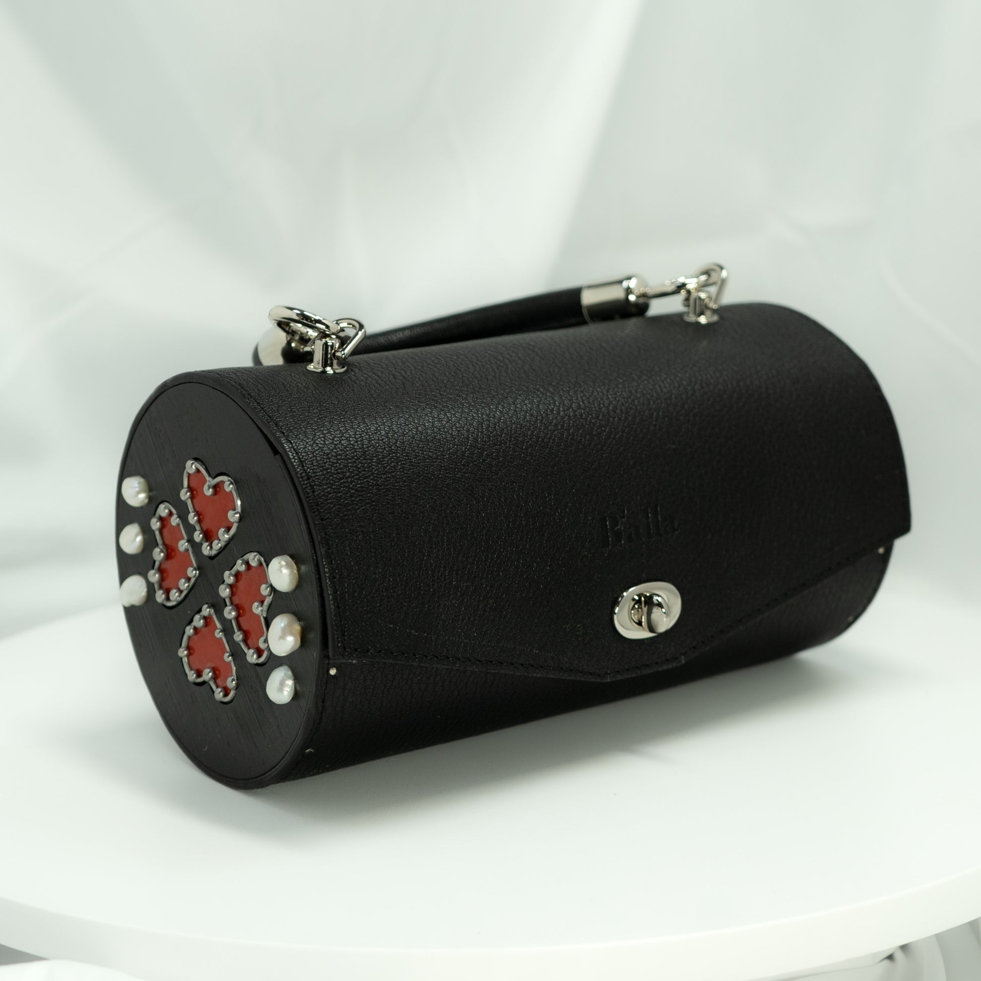 Crafted from Italian leather, lined with Alcantara inside, with American oak walls. Silver-toned hardware imported from Italy. Decorative heart-shaped glass elements. The bag features a short leather handle.