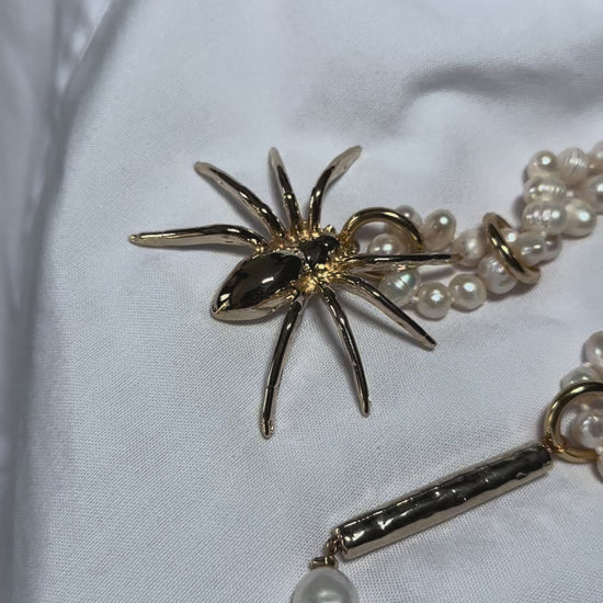 At its center, a striking gold-tone spider pendant adds an unexpected, avant-garde twist — symbolizing creativity, strength, and feminine power. Complementing the design is a refined gold-tone bar charm with a delicate pearl drop, bringing balance and sophistication to this statement piece.